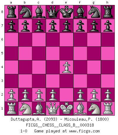 Last move : 1-0 2020 February 26 22:27:52 [Event "FICGS__CHESS__CLASS_B__000318"] [Site "FICGS"] [Date "2020.01.16"] [Round "1"] [White "Duttagupta,Aniruddha"] [Black "Micouleau,Patrick"] [Result "1-0"] [WhiteElo "2093"] [BlackElo "1800"] 1.e4 1-0 This chess game has been lost on time (started : 2020.01.16 8:37:4) King's pawn Opening Player White won this chess game. Follow this game move after move (download)After black's reply to 1.e4 with 1..e5, leaves him always trying to get into the game. (Howard Staunton) Gott hat gewollt, dass ich Champion werde. (Surab Azmajparaschvili) Botvinnik trataba de restarle el misterio al Ajedrez, siempre relacionandolo a situaciones de la vida ordinaria. El gustaba de llamar al Ajedrez un típico problema inexacto similar a aquellos de los cuales la gente siempre tiene que enfrentarse en la vida cotidiana. (Garry Kasparov) La menace est plus forte que l'exécution. (Aaron Nimzovitch) The absolute truth is the thing that makes people laugh. (Carl Reiner)