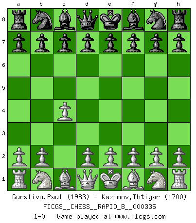 Last move : 1-0 2020 February 15 21:47:39 [Event "FICGS__CHESS__RAPID_B__000335"] [Site "FICGS"] [Date "2020.01.16"] [Round "1"] [White "Guralivu,Paul"] [Black "Kazimov,Ihtiyar"] [Result "1-0"] [WhiteElo "1983"] [BlackElo "1700"] 1.c4 1-0 This chess game has been lost on time (started : 2020.01.16 8:37:28) English Opening Player White won this chess game. Follow this game move after move (download)Strategy requires thought, tactics require observation. (Max Euwe) Über die Verhaftung Bobby Fischers: Warum es die Bush-Administration für nötig befindet einen 61 Jahre alten Mann zu hetzten, der für niemanden ausser sich selbste eine Gefahr darstellt ist ein Rätsel. (Nigel Short) La mitad de las variaciones que son calculadas en una partida de torneo, resultan ser completamente superfluas. Desafortunadamente, nadie sabe por adelantado cual mitad. (Jan Tinman) La tactique est l'élément le plus important du milieu de jeu. (Siegbert Tarrasch) First of all, we have to go back to the classical time control. (Anatoly Karpov)
