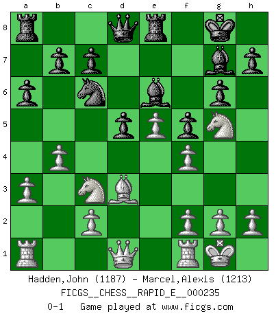 Last move : 0-1 2020 March 25 0:38:12 [Event "FICGS__CHESS__RAPID_E__000235"] [Site "FICGS"] [Date "2020.01.21"] [Round "1"] [White "Hadden,John"] [Black "Marcel,Alexis"] [Result "0-1"] [WhiteElo "1187"] [BlackElo "1213"] 1.d4 f5 2.Bf4 Nf6 3.e3 g6 4.Nc3 Bg7 5.Bc4 d5 6.Bd3 O-O 7.Nf3 Re8 8.O-O Nc6 9.a3 Nh5 10.b4 e5 11.dxe5 Nxf4 12.exf4 Be6 13.Ng5 a6 0-1 This chess game has been lost on time (started : 2020.01.21 0:48:30) Dutch Kingside Castling by player Black (move 6) Kingside Castling by player White (move 8) Player Black won this chess game. Follow this game move after move (download)Chess is the art of analysis. (Mikhail Botvinnik) Bis jetzt ist Weiß einer wohlbekannten Analyse gefolgt. Aber jetzt begeht er einen schrecklichen Fehler: Er beginnt seinen eigenen Kopf zu benutzen. (Siegbert Tarrasch) Hay jugadores fuertes y personas amables y yo soy un jugador fuerte. (Bobby Fischer) La guerre est enfant de la passion, la passion est enfant du narcissisme et le narcissisme est l'enfant. (...) Une autre partie ? (Thibault de Vassal) When a man with money meets a man with experience, the man with experience leaves with money and the man with money leaves with experience. (Anonymous)