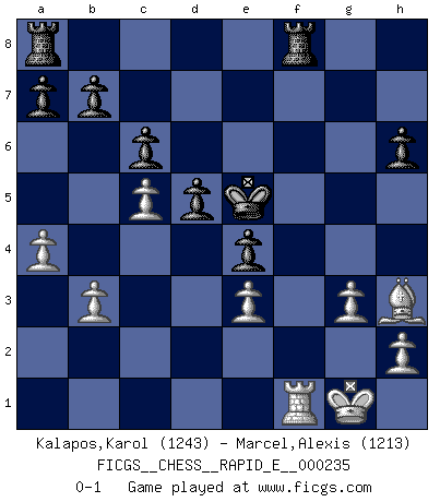 Last move : 0-1 2020 March 3 21:58:44 [Event "FICGS__CHESS__RAPID_E__000235"] [Site "FICGS"] [Date "2020.01.21"] [Round "1"] [White "Kalapos,Karol"] [Black "Marcel,Alexis"] [Result "0-1"] [WhiteElo "1243"] [BlackElo "1213"] 1.d4 f5 2.c4 Nf6 3.Nc3 g6 4.g3 Bg7 5.Bg2 O-O 6.Qb3 d6 7.Nf3 Re8 8.Ng5 c6 9.e3 h6 10.c5 d5 11.Nh3 Nbd7 12.Nf4 Kf7 13.O-O e5 14.dxe5 Nxe5 15.a4 g5 16.Nh3 Ne4 17.Nxe4 fxe4 18.Bd2 Nc4 19.Bc3 Bxc3 20.Qxc3 Qe7 21.b3 Ne5 22.f4 gxf4 23.Nxf4 Kg8 24.Nh5 Kh8 25.Rf6 Kh7 26.Raf1 Bg4 27.Qxe5 Qxe5 28.Rf7+ Kg8 29.Nf6+ Kxf7 30.Nxg4 Ke6 31.Nxe5 Kxe5 32.Bh3 Rf8 0-1 Dutch with c4 & Nc3 Kingside Castling by player Black (move 5) Kingside Castling by player White (move 13) Player Black won this chess game. Follow this game move after move (download)It is the aim of the modern school, not to treat every position according to one general law, but according to the principle inherent in the position. (Richard Reti) Ich rechne überhaupt nicht voraus. Ich gewinne auch so. (Robert James Fischer) No es tiempo de jugar al Ajedrez cuando la casa esta en llamas. (Proverbio Italiano) L'ordinateur a tué l'originalité. Il n'y a plus guère d'aventures sur l'échiquier. (Jacob Murray) The good fighters of old first put themselves beyond the possibility of defeat, and then waited for an opportunity of defeating the enemy. (Sun Tzu)