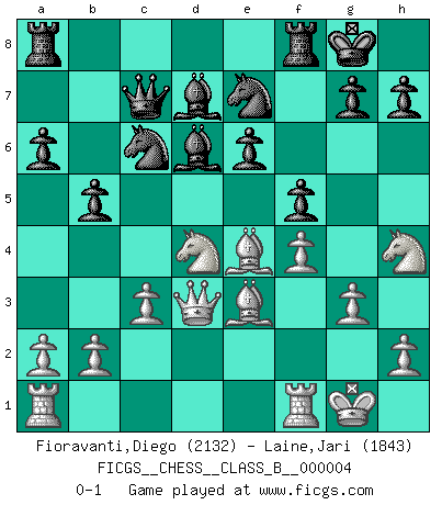 Last move : 0-1 2006 August 15 19:13:26 [Event "FICGS__CHESS__CLASS_B__000004"] [Site "FICGS"] [Date "2006.06.19"] [Round "1"] [White "Fioravanti,Diego"] [Black "Laine,Jari"] [Result "0-1"] [WhiteElo "2132"] [BlackElo "1843"] 1.e4 e6 2.d3 d5 3.Nd2 c5 4.Ngf3 Nc6 5.g3 Bd6 6.Bg2 Nge7 7.O-O O-O 8.Nh4 Qc7 9.f4 f6 10.c3 Bd7 11.Qe2 b5 12.Nb3 c4 13.Nd4 cxd3 14.Qxd3 a6 15.Be3 dxe4 16.Bxe4 f5 0-1 French : King's Indian attack Kingside Castling by player White (move 7) Kingside Castling by player Black (move 7) Player Black won this chess game. Follow this game move after move (download)In a gambit you give up a Pawn for the sake of getting a lost game. (Samuel Standige Boden) Fischer ist das größte Genie, das je vom Schachhimmel heruntergestiegen ist. (Mikhail Nekhemyevich Tal) Alguna parte de un error es siempre correcto. (Savielly Tartakover) Des points faibles ou des trous dans la position de l'adversaire doivent être occupés par des pièces et non pas par des pions. (Siegbert Tarrasch) As the days dwindle down... to a precious few. (Maxwell Anderson)