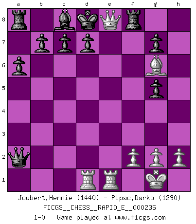 Last move : 1-0 2020 February 15 19:35:21 [Event "FICGS__CHESS__RAPID_E__000235"] [Site "FICGS"] [Date "2020.01.21"] [Round "1"] [White "Joubert,Hennie"] [Black "Pipac,Darko"] [Result "1-0"] [WhiteElo "1440"] [BlackElo "1290"] 1.e4 e5 2.Nf3 Nc6 3.Bc4 h6 4.d4 exd4 5.c3 dxc3 6.Qb3 Qf6 7.O-O a6 8.Nxc3 Nge7 9.Nd5 Nxd5 10.exd5 Nd4 11.Nxd4 Qxd4 12.d6 Qxd6 13.Bxf7+ Kd8 14.Re1 Be7 15.Be3 Rf8 16.Bh5 Bf6 17.Rad1 Qe5 18.Bg6 Qxb2 19.Qd3 Qxa2 20.Qe4 Bg5 21.Bxg5+ hxg5 22.Qe8+ 1-0 King's pawn game Kingside Castling by player White (move 7) Player White won this chess game. Follow this game move after move (download)The chessboard is the world, the pieces are the phenomena of the Universe, the rules of the game are what we call the laws of Nature and the player on the other side is hidden from us. (Thomas Huxley) Modernes Schach sorgt sich zuviel um Dinge wie Bauernstruktur usw. Vergessen Sie das, Schachmatt beendet das Spiel! (Nigel Short) Prefiero perder una partida realmente buena, que ganar una mala. (David Levy) Vous n'êtes pas toujours obligé de jouer le meilleur coup. Un coup doit être actif, entreprenant, correct et beau ! (David Bronstein) All men can see these tactics whereby I conquer, but what none can see is the strategy out of which victory is evolved. (Sun Tzu)
