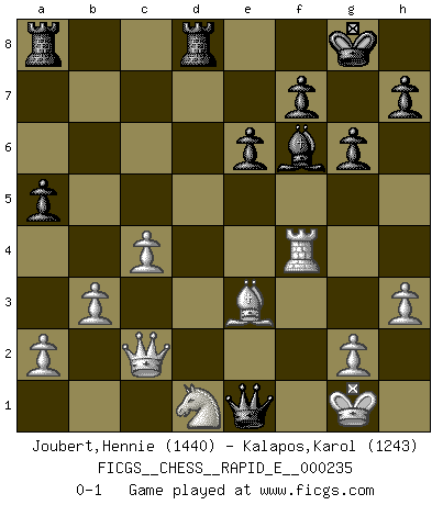 Last move : 0-1 2020 February 7 12:7:23 [Event "FICGS__CHESS__RAPID_E__000235"] [Site "FICGS"] [Date "2020.01.21"] [Round "1"] [White "Joubert,Hennie"] [Black "Kalapos,Karol"] [Result "0-1"] [WhiteElo "1440"] [BlackElo "1243"] 1.e4 c5 2.Nf3 d6 3.d4 cxd4 4.Nxd4 Nf6 5.Nc3 g6 6.f4 Bg7 7.e5 dxe5 8.fxe5 Ng4 9.Bb5+ Bd7 10.Qxg4 Bxe5 11.Qe4 Bg7 12.O-O O-O 13.Be3 Nc6 14.Bxc6 Bxc6 15.Nxc6 bxc6 16.Qxc6 Qa5 17.Qa4 Qe5 18.Rae1 Qb8 19.Nd1 a5 20.c3 Be5 21.h3 Rd8 22.Qc2 Bf6 23.Bf2 e6 24.b3 Qb5 25.c4 Qg5 26.Be3 Qh4 27.Rf4 Qxe1+ 0-1 Sicilian : Dragon, Levenfish variation Kingside Castling by player White (move 12) Kingside Castling by player Black (move 12) Player Black won this chess game. Follow this game move after move (download)First-class players lose to second class players because second-class players sometimes play a first-class game. (Tarrasch) Ich bin Weltmeister und muß mit niemandem irgend etwas diskutieren. (Viswanathan Anand) No es tiempo de jugar al Ajedrez cuando la casa esta en llamas. (Proverbio Italiano) RxDa4 pat (...) Wikichess, chess moves explained by 'experimented' players. (Thibault de Vassal)