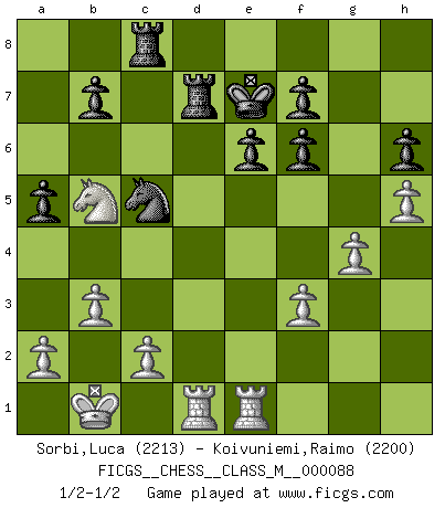 Last move : 1/2-1/2 2020 July 24 9:46:27 [Event "FICGS__CHESS__CLASS_M__000088"] [Site "FICGS"] [Date "2020.01.22"] [Round "1"] [White "Sorbi,Luca"] [Black "Koivuniemi,Raimo"] [Result "1/2-1/2"] [WhiteElo "2213"] [BlackElo "2200"] 1.e4 c6 2.d4 d5 3.Nc3 dxe4 4.Nxe4 Bf5 5.Ng3 Bg6 6.h4 h6 7.Nf3 Nd7 8.h5 Bh7 9.Bd3 Bxd3 10.Qxd3 Ngf6 11.Bd2 e6 12.O-O-O Be7 13.Kb1 Qb6 14.Rhe1 c5 15.Qc4 a5 16.Bc3 O-O 17.Nf5 Bd8 18.dxc5 Qxc5 19.Qxc5 Nxc5 20.Nd6 Be7 21.Bxf6 gxf6 22.Nf5 Rfe8 23.Nxe7+ Rxe7 24.g4 Rc8 25.Nd4 Rd7 26.Nb5 Kf8 27.f3 Ke7 28.b3 1/2-1/2 Caro-Kann : Classical, 7...Nd7 Queenside Castling by player White (move 12) Kingside Castling by player Black (move 16) This chess game ended in a draw. Follow this game move after move (download)With or without the title, Bobby Fischer was unquestionably the greatest player of his time. (Burt Hochberg) Ich kenne Menschen, die allen Willen der Welt besitzen und doch nicht Schach spielen können. (Robert James Fischer) El jugador de combinación piensa hacia adelante; comienza de la posición dada y trabaja las movidas contundentes en su mente. (Emanuel Lasker) La guerre est enfant de la passion, la passion est enfant du narcissisme et le narcissisme est l'enfant. (...) Une autre partie ? (Thibault de Vassal) Perception is reality. (Immanuel Kant)