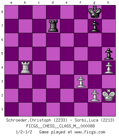 Last move : 1/2-1/2 2020 July 16 19:37:52 [Event "FICGS__CHESS__CLASS_M__000088"] [Site "FICGS"] [Date "2020.01.22"] [Round "1"] [White "Schroeder,Christoph"] [Black "Sorbi,Luca"] [Result "1/2-1/2"] [WhiteElo "2233"] [BlackElo "2213"] 1.d4 Nf6 2.c4 e6 3.Nc3 Bb4 4.f3 d5 5.a3 Bxc3+ 6.bxc3 c5 7.cxd5 Nxd5 8.dxc5 Qa5 9.e4 Ne7 10.Be3 O-O 11.Qb3 Qc7 12.Bb5 Nec6 13.Ne2 Na5 14.Qb4 e5 15.Nd4 Nbc6 16.Qb2 exd4 17.cxd4 f5 18.O-O Bd7 19.d5 Ne5 20.d6 Qc8 21.Bxd7 Nxd7 22.e5 f4 23.Bd4 Nc6 24.e6 Nxd4 25.Qxd4 Qxc5 26.Rad1 h6 27.Rfe1 Qxd4+ 28.Rxd4 Rfe8 29.Rc4 b5 30.Rc7 Nb6 31.h4 Rad8 32.d7 Re7 33.Re4 a5 34.Rc6 Nxd7 35.Rd6 R7e8 36.Red4 b4 37.axb4 axb4 38.exd7 Re7 39.Rxf4 Rexd7 40.Rxd7 Rxd7 41.Rxb4 h5 42.Kh2 1/2-1/2 Nimzo-Indian : Kmoch variation Kingside Castling by player Black (move 10) Kingside Castling by player White (move 18) 10 pieces endgame at move 40 : White KRPPP , Black KRPPP WHITE : King + 1 Rook 3 Pawns BLACK : King + 1 Rook 3 Pawns 9 pieces endgame at move 41 : White KRPPP , Black KRPP WHITE : King + 1 Rook 3 Pawns BLACK : King + 1 Rook 2 Pawns This chess game ended in a draw. Follow this game move after move (download)Botvinnik tried to take the mystery out of Chess, always relating it to situations in ordinary life. He used to call Chess a typical inexact problem similar to those which people are always having to solve in everyday life. (Garry Kasparov) Du weisst es gibt ein Problem mit Computern und Fernschach, wenn jeder eine Rating von 2450 hat. (John Christen Knudsen) Diferente gente reacciona diferentemente en aceptar la derrota. (Bobby Fischer) Assurément je connaissais par expérience le mystérieux attrait de ce jeu royal, le seul entre tous les jeux inventés par les hommes qui échappe souverainement à la tyrannie du hasard, le seul où l'on ne doive sa victoire qu'à son intelligence ou plutôt à une certaine forme d'intelligence. Mais n'est-ce pas déjà le limiter injurieusement que d'appeler les échecs un jeu ? N'est-ce pas une science, un art ou quelque chose qui, comme le cercueil de Mahomet entre ciel et terre, est suspendu entre l'un et l'autre, et qui réunit un nombre incroyable de contraires ? [...] C'est une pensée qui ne mène à rien, une mathématique qui n'établit rien, un art qui ne laisse pas d'uvre, une architecture sans matière; et il l'a prouvé néanmoins qu'il était plus durable, à sa manière, que les livres ou que tout autre monument, ce jeu unique qui appartient à tous les peuples et à tous les temps, et dont personne ne sait quel dieu en fit don à la terre pour tuer l'ennui, pour aiguiser l'esprit et stimuler l'âme. Où commence-t-il, où finit-il ? (Stefan Zweig) May the force be with you. (Han Solo in Star Wars ep.4)