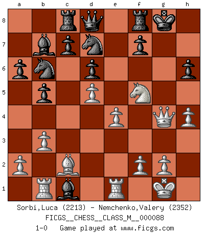 Last move : 1-0 2020 February 5 7:49:32 [Event "FICGS__CHESS__CLASS_M__000088"] [Site "FICGS"] [Date "2020.01.22"] [Round "1"] [White "Sorbi,Luca"] [Black "Nemchenko,Valery"] [Result "1-0"] [WhiteElo "2213"] [BlackElo "2352"] 1.e4 e5 2.Nf3 Nc6 3.Bb5 a6 4.Ba4 Nf6 5.O-O Be7 6.Re1 b5 7.Bb3 O-O 8.c3 Bb7 9.d4 d6 10.Nbd2 h6 11.Nf1 Na5 12.Bc2 exd4 13.cxd4 Nc4 14.b3 Nb6 15.d5 Nfd7 16.Nd4 Bf6 17.Rb1 Rc8 18.Ng3 g6 19.Ndf5 gxf5 20.Nxf5 Bg5 21.h4 Bxc1 22.Qg4+ 1-0 Ruy Lopez : Closed, 7...O-O Kingside Castling by player White (move 5) Kingside Castling by player Black (move 7) Player White won this chess game. Follow this game move after move (download)Chess is above all, a fight ! (Emanuel Lasker) Ich suche im Schach immer etwas Eigenes. Riskantes Spiel im Stile schachlicher Musketiere ist nicht meine Sache, auch wenn es vielen Freunden scharfer Wendungen gefällt. (Anatoly Karpov) El Ajedrez, como cualquier actividad creativa, solo puede existir a través del esfuerzo combinado de aquellos que tienen talento creativo y de aquellos que poseen la habilidad de organizar su trabajo creativo. (Mikhail Botvinnik) Donnez-moi un Cavalier en 6e et je gagnerais toutes mes parties. (Steinitz) Fortune favours the audacious. (Desiderius Erasmus)
