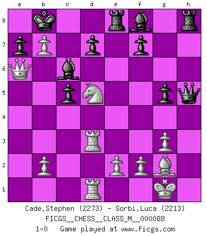 Last move : 1-0 2020 May 20 19:28:19 [Event "FICGS__CHESS__CLASS_M__000088"] [Site "FICGS"] [Date "2020.01.22"] [Round "1"] [White "Cade,Stephen"] [Black "Sorbi,Luca"] [Result "1-0"] [WhiteElo "2273"] [BlackElo "2213"] 1.d4 Nf6 2.c4 e6 3.Nf3 b6 4.g3 Ba6 5.Qc2 c5 6.d5 exd5 7.cxd5 Bb7 8.Bg2 Nxd5 9.O-O Be7 10.Rd1 Nc6 11.Qa4 Nf6 12.Nh4 g6 13.Bh6 Bf8 14.Bg5 h6 15.Bxf6 Qxf6 16.Nc3 O-O-O 17.Rd3 g5 18.Nf3 Na5 19.Rad1 Bc6 20.Qc2 Re8 21.Nd2 Kb8 22.Nd5 Qg6 23.Nc4 Nb7 24.a4 h5 25.a5 b5 26.a6 bxc4 27.Qxc4 h4 28.axb7 hxg3 29.hxg3 Qh5 30.Qa6 1-0 Queen's Indian : Nimzovich variation (exaggerated Fianchetto) Kingside Castling by player White (move 9) Queenside Castling by player Black (move 16) Player White won this chess game. Follow this game move after move (download)A thorough understanding of the typical mating continuations makes the most complicated sacrificial combinations leading up to them not only not difficult, but almost a matter of course. (Siegbert Tarrasch) Der Partner hat auch seine Existenzberechtigung. (Savielly Grigorievitsch Tartakower) El Ajedrez expande y enriquece tu mente. (Saudin Robovic) Les Echecs ont trois composantes : le temps, l'espace et le matériel en dernier. (Mikhail Tal) Is not life a hundred times too short to bore ourselves ? (Friedrich Nietzsche)