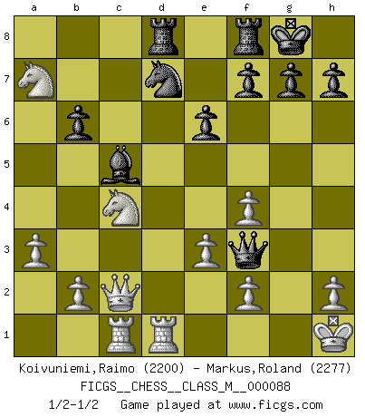Last move : 1/2-1/2 2020 March 5 7:3:53 [Event "FICGS__CHESS__CLASS_M__000088"] [Site "FICGS"] [Date "2020.01.22"] [Round "1"] [White "Koivuniemi,Raimo"] [Black "Markus,Roland"] [Result "1/2-1/2"] [WhiteElo "2200"] [BlackElo "2277"] 1.d4 Nf6 2.c4 e6 3.g3 d5 4.Nf3 Bb4+ 5.Bd2 Be7 6.Bg2 O-O 7.O-O c6 8.Qc2 b6 9.Rd1 Nbd7 10.Bf4 Bb7 11.Nc3 dxc4 12.Nd2 Nd5 13.Nxc4 Nxf4 14.gxf4 Qc7 15.e3 Rad8 16.Rac1 c5 17.Nb5 Qb8 18.Bxb7 Qxb7 19.dxc5 Bxc5 20.a3 Qf3 21.Nxa7 Qg4+ 22.Kh1 Qf3+ 1/2-1/2 Catalan Opening Kingside Castling by player Black (move 6) Kingside Castling by player White (move 7) This chess game ended in a draw. Follow this game move after move (download)No other master has such a terrific will to win. At the board he radiates danger, and even the strongest opponents tend to freeze, like rabbits when they smell a panther. Even his weaknesses are dangerous. As white, his opening game is predictable - you can make plans against it - but so strong that your plans almost never work. In the middle game his precision and invention are fabulous, and in the end game you simply cannot beat him. (Anonymous German Expert) Frage des Reporters: -Worin besteht das Ziel von Gambiteröffnungen? Antwort: -Auf Kosten der Partie einen Ruf als Angriffspieler zu erwerben.- (Siegbert Tarrasch) Hay jugadores fuertes y personas amables y yo soy un jugador fuerte. (Bobby Fischer) Le succès, c'est être capable d'aller d'échec en échec sans perdre son enthousiasme. (Winston Churchill) The difference between perseverance and obstinacy is that one comes from a strong will, and the other from a strong won't. (Henry Ward Beecher)
