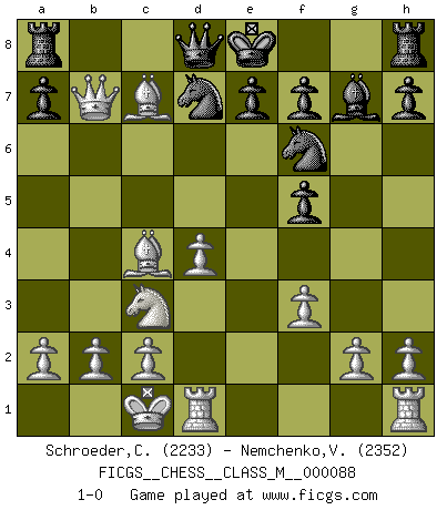 Last move : 1-0 2020 January 26 19:21:31 [Event "FICGS__CHESS__CLASS_M__000088"] [Site "FICGS"] [Date "2020.01.22"] [Round "1"] [White "Schroeder,Christoph"] [Black "Nemchenko,Valery"] [Result "1-0"] [WhiteElo "2233"] [BlackElo "2352"] 1.e4 d5 2.exd5 Qxd5 3.Nc3 Qa5 4.Bc4 Qe5+ 5.Nge2 Nf6 6.d4 Qd6 7.Bf4 Qd8 8.Qd3 g6 9.O-O-O Bf5 10.Qf3 Bg7 11.Qxb7 Nbd7 12.Ng3 Bg4 13.f3 Bf5 14.Nxf5 gxf5 15.Bxc7 1-0 Scandinavian (centre counter) defense Queenside Castling by player White (move 9) Player White won this chess game. Follow this game move after move (download)Why must I lose to this idiot ? (Aron Nimzovich) Später, ... hatte ich zunehmend Erfolg in entscheidenden Partien. Vielleicht weil ich eine einfache Wahrheit erkannte: nicht nur ich hatte Angst, auch mein Gegner. (Mikhail Nekhemyevich Tal) Tu puedes aprender mucho mas de una partida que pierdas que de una partida ganada. Tendras que perder cientos de partidas antes de llegar a ser un buen jugador. (Jose Raul Capablanca) Il n'y a plus de joueurs du niveau de Jacob Murray dont la seule quête est le beau jeu, le plaisir de voir les pièces construire quelque chose. Sur 10 idées à la minute, 9 seront sans intérêt, la dernière s'avèrera géniale. (Christian Bauer) The project of the man are lower than those of the sky. (Chinese proverb)