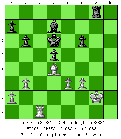 Last move : 1/2-1/2 2020 February 9 10:45:23 [Event "FICGS__CHESS__CLASS_M__000088"] [Site "FICGS"] [Date "2020.01.22"] [Round "1"] [White "Cade,Stephen"] [Black "Schroeder,Christoph"] [Result "1/2-1/2"] [WhiteElo "2273"] [BlackElo "2233"] 1.d4 Nf6 2.c4 e6 3.Nf3 d5 4.Nc3 Be7 5.Bf4 O-O 6.e3 b6 7.cxd5 Nxd5 8.Nxd5 Qxd5 9.Bxc7 Bb4+ 10.Nd2 Nc6 11.f3 Bd7 12.Kf2 Nxd4 13.Ne4 Rfc8 14.Rc1 Nb5 15.Bxb5 Bxb5 16.Nd6 Bxd6 17.Qxd5 exd5 18.Bxd6 f6 19.g4 Kf7 20.Bb4 Rc4 21.Bc3 h5 22.gxh5 Rh4 23.Bd4 Ke6 24.h3 Rxh5 25.h4 Bd7 26.b3 Kd6 27.Rhg1 Rxh4 28.Rxg7 Rh2+ 29.Rg2 Rxg2+ 30.Kxg2 Rg8+ 1/2-1/2 Queen's pawn game Kingside Castling by player Black (move 5) This chess game ended in a draw. Follow this game move after move (download)My style is somewhere between that of Tal and Petrosian. (Reshevsky) Charakterschwächen offenbaren sich normalerweise während einer Schachpartie. (Garry Kasparov) Aún el Rey más flojo huye despavorido ante la amenaza de un Jaque doble. (Aaron Nimzowitsch) Shah mat. Le roi est mort. Cri de fierté d'un joueur venant de terrasser son adversaire, courtoisement, sans effusion de sang. This is where the fun begins. (Anakin Skywalker in Star Wars ep.3)