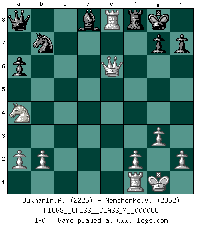 Last move : 1-0 2020 February 18 14:58:43 [Event "FICGS__CHESS__CLASS_M__000088"] [Site "FICGS"] [Date "2020.01.22"] [Round "1"] [White "Bukharin,Alexey"] [Black "Nemchenko,Valery"] [Result "1-0"] [WhiteElo "2225"] [BlackElo "2352"] 1.Nf3 c5 2.c4 Nf6 3.Nc3 Nc6 4.g3 b6 5.Bg2 Bb7 6.O-O e6 7.e4 a6 8.d4 cxd4 9.Nxd4 Be7 10.e5 Nxe5 11.Bxb7 Ra7 12.Bg2 Nxc4 13.Qe2 Na5 14.Be3 O-O 15.Na4 d5 16.Nxe6 fxe6 17.Bxb6 Qd7 18.Bxa7 Qxa7 19.Qxe6+ Kh8 20.Bxd5 Nxd5 21.Qxd5 Nb7 22.Qd7 Bd8 23.Rae1 Qa8 24.Re8 Kg8 25.Qe6+ 1-0 Reti Opening Kingside Castling by player White (move 6) Kingside Castling by player Black (move 14) Player White won this chess game. Follow this game move after move (download)All Chess players should have a hobby. (Savielly Tartakower) Wie bekannt hörte Morphy 1859 auf, Schach zu spielen. Seine Enttäuschung galt nicht so sehr dem Schach, wie den Schachspielern. (Robert James Fischer) Debemos de asegurarnos de que el Ajedrez no se convierta en un lenguaje muerto, muy interesante, pero tan solo para un grupo muy pequeño. (Sytze Faber) On peut tirer plus d'utilité d'une partie perdue que de 100 parties gagnées. (Capablanca) I have opinions of my own - strong opinions - but I don't always agree with them. (George Bush)