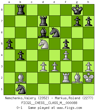 Last move : 0-1 2020 March 5 18:58:15 [Event "FICGS__CHESS__CLASS_M__000088"] [Site "FICGS"] [Date "2020.01.22"] [Round "1"] [White "Nemchenko,Valery"] [Black "Markus,Roland"] [Result "0-1"] [WhiteElo "2352"] [BlackElo "2277"] 1.c4 Nf6 2.Nc3 c5 3.g3 d5 4.cxd5 Nxd5 5.Bg2 Nc7 6.Nf3 Nc6 7.O-O e5 8.d3 Be7 9.b3 O-O 10.Bb2 f6 11.a3 Bg4 12.h3 Be6 13.Nd2 Qd7 14.Kh2 b6 15.Nf3 Rad8 16.b4 cxb4 17.axb4 Bxb4 18.Nd2 a5 19.Qa4 Nd4 20.Qxd7 Rxd7 21.Nde4 Rb8 22.Na2 Bf8 23.Nac3 Nb3 24.Rab1 b5 25.f4 exf4 26.gxf4 f5 27.Ng5 Nd2 28.Nxe6 Nxe6 29.Nd5 Bd6 30.e3 b4 31.Rf2 Nxb1 0-1 English Opening Kingside Castling by player White (move 7) Kingside Castling by player Black (move 9) Player Black won this chess game. Follow this game move after move (download)There must have been a time when men were demigods, or they could not have invented Chess. (Gustav Schenk) Spiel ein langweiliges Spiel zu Ende und lustige Dinge können passieren. (Hans Ree) Yo nunca en mi vida he jugado la Defensa Francesa, que viene siendo la más aburrida de todas las Aperturas. (Wilhelm Steinitz) Que feriez-vous si vous étiez en train de jouer aux échecs et que la fin du monde arrive ? Je continuerais à jouer. (Saint Borromée) If passion drives you, let reason holds the reins. (Benjamin Franklin)