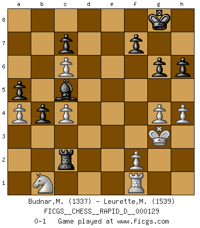 Last move : 0-1 2020 February 20 20:13:54 [Event "FICGS__CHESS__RAPID_D__000129"] [Site "FICGS"] [Date "2020.01.26"] [Round "1"] [White "Budnar,Milos"] [Black "Leurette,Marc-Antoine"] [Result "0-1"] [WhiteElo "1337"] [BlackElo "1539"] 1.e4 e5 2.Nf3 Nc6 3.Bb5 a6 4.Ba4 b5 5.Bb3 Nf6 6.O-O Bc5 7.a4 b4 8.c3 a5 9.Bd5 Nxd5 10.exd5 Ne7 11.d4 Bd6 12.dxe5 Bc5 13.Be3 d6 14.exd6 Bxd6 15.Bg5 O-O 16.Bxe7 Qxe7 17.h3 Qf6 18.Qd4 Qxd4 19.Nxd4 Bb7 20.c4 Be5 21.Rd1 Rfe8 22.Ra2 Bd6 23.b3 g6 24.Re2 Bc5 25.Rxe8 Rxe8 26.Nc6 Re2 27.Rf1 Bxc6 28.dxc6 Rb2 29.g4 Rxb3 30.Kg2 Rb2 31.h4 h6 32.Kg3 Rc2 0-1 Ruy Lopez : Caro variation Kingside Castling by player White (move 6) Kingside Castling by player Black (move 15) Player Black won this chess game. Follow this game move after move (download)Fischer prefers to enter Chess history alone. (Miguel Najdorf) Fischer: 'Remis!?' Uhlmann: 'Aber es muss doch dreimal Zugwiederholung sein!' Fischer: 'Sie nehmen das Remis an, wie ich es sage, sonst spiele ich weiter und werde Sie dann schlagen!' (Robert James Fischer) Debió haber existido una vez en que los hombres eran semidióses, de otra manera no hubiesen podido inventar el Ajedrez. (Gustav Schenk) Assurément je connaissais par expérience le mystérieux attrait de ce jeu royal, le seul entre tous les jeux inventés par les hommes qui échappe souverainement à la tyrannie du hasard, le seul où l'on ne doive sa victoire qu'à son intelligence ou plutôt à une certaine forme d'intelligence. Mais n'est-ce pas déjà le limiter injurieusement que d'appeler les échecs un jeu ? N'est-ce pas une science, un art ou quelque chose qui, comme le cercueil de Mahomet entre ciel et terre, est suspendu entre l'un et l'autre, et qui réunit un nombre incroyable de contraires ? [...] C'est une pensée qui ne mène à rien, une mathématique qui n'établit rien, un art qui ne laisse pas d'uvre, une architecture sans matière; et il l'a prouvé néanmoins qu'il était plus durable, à sa manière, que les livres ou que tout autre monument, ce jeu unique qui appartient à tous les peuples et à tous les temps, et dont personne ne sait quel dieu en fit don à la terre pour tuer l'ennui, pour aiguiser l'esprit et stimuler l'âme. Où commence-t-il, où finit-il ? (Stefan Zweig) Information on the Internet is subject to the same rules and regulations as conversation at a bar. (George Lundberg)