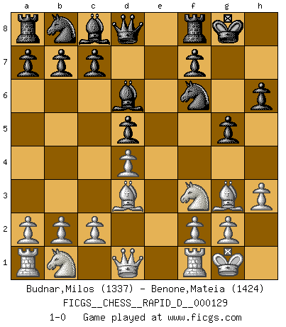 Last move : 1-0 2020 April 4 20:41:47 [Event "FICGS__CHESS__RAPID_D__000129"] [Site "FICGS"] [Date "2020.01.26"] [Round "1"] [White "Budnar,Milos"] [Black "Benone,Mateia"] [Result "1-0"] [WhiteElo "1337"] [BlackElo "1424"] 1.e4 e5 2.Nf3 Nf6 3.Nxe5 d6 4.Nf3 Nxe4 5.d4 d5 6.Bd3 Nf6 7.h3 Bd6 8.Bg5 O-O 9.O-O h6 10.Bh4 g5 11.Bg3 1-0 Petrov : Classical attack Kingside Castling by player Black (move 8) Kingside Castling by player White (move 9) Player White won this chess game. Follow this game move after move (download)Your body has to be in top condition. Your Chess deteriorates as your body does. You can't separate body from mind. (Bobby Fischer) Verschiedene, sehr schätzbare und im Laufe des Lebens nützliche Eigenschaften des Geistes können durch das Schachspiel erworben und gekräftigt werden, so dass sie zu Gewohnheiten werden, die uns nie im Stich lassen. (Benjamin Franklin) El Ajedrez es la vida. (Bobby Fischer) Même un GMI sait rarement calculer sur plus de cinq coups une attaque à sacrifices. (Rudolf Spielmann) Fear is the path to the dark side. Fear leads to anger; anger leads to hate; hate leads to suffering. I sense much fear in you. (Master Yoda in Star Wars ep.1)