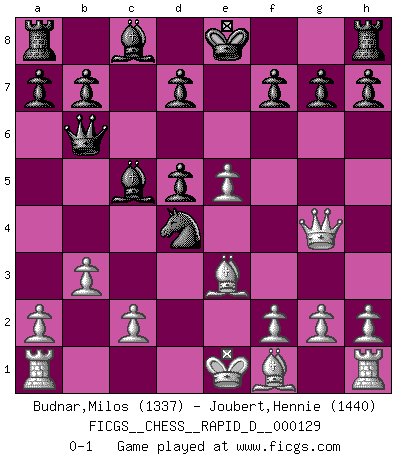 Last move : 0-1 2020 February 18 15:42:34 [Event "FICGS__CHESS__RAPID_D__000129"] [Site "FICGS"] [Date "2020.01.26"] [Round "1"] [White "Budnar,Milos"] [Black "Joubert,Hennie"] [Result "0-1"] [WhiteElo "1337"] [BlackElo "1440"] 1.e4 c5 2.Nf3 e6 3.d4 cxd4 4.Nxd4 Nf6 5.Nc3 Qb6 6.e5 Bc5 7.Be3 Nd5 8.Nxd5 exd5 9.b3 Nc6 10.Qg4 Nxd4 0-1 Sicilian : Anderssen variation Player Black won this chess game. Follow this game move after move (download)In Fischer's hands, a slight theoretical advantage is as good a being a Queen ahead. (Isaac Kashdan) Ich kenne keine einzige Person, die behaupten würde, Garri Kasparow sei ein guter Mensch (Nigel Short) Un jugador que es sorprendido, esta derrotado a medias. (Proverbio) Dans le domaine de la peinture, de la gravure et de la sculpture, dès la première décennie de notre siècle, les artistes abandonnent la représentation de la partie d'échecs pour se concentrer sur les pièces, sur les échiquiers et sur toutes les variations auxquelles les unes et les autres peuvent donner lieu. On passe en quelque sorte d'un thème social à un thème musical (au sens de la musica médiévale, c'est-à-dire d'une notion qui inclue le rythme, l'harmonie, la construction et la déconstruction, etc.). Graphiquement et picturalement, l'échiquier apparaît comme une structure ouverte, dynamique, d'une richesse infinie, autorisant toutes les combinatoires et débouchant sur des mouvements et des rythmes de nature exponentielle. (Michel Pastoureau) Unless in communicating with it one says exactly what one means, trouble is bound to result. (Alan Turing, about computers)