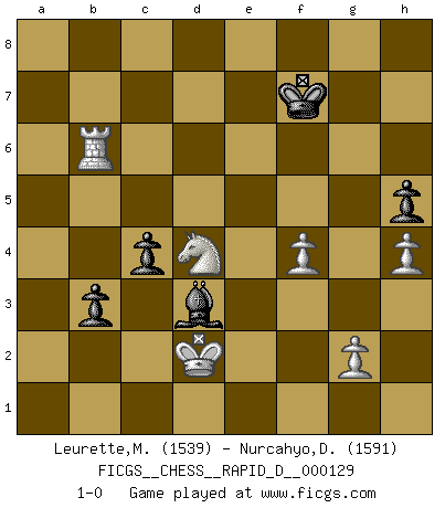 Last move : 1-0 2020 April 4 17:14:50 [Event "FICGS__CHESS__RAPID_D__000129"] [Site "FICGS"] [Date "2020.01.26"] [Round "1"] [White "Leurette,Marc-Antoine"] [Black "Nurcahyo,Dery"] [Result "1-0"] [WhiteElo "1539"] [BlackElo "1591"] 1.e4 e5 2.Nf3 d6 3.Nc3 c6 4.d4 Nd7 5.dxe5 dxe5 6.Bc4 h6 7.b3 Qa5 8.Bd2 Bb4 9.Ne2 Ngf6 10.c3 Be7 11.Ng3 b5 12.Be2 Qc7 13.O-O Nb6 14.a4 a6 15.axb5 axb5 16.Rxa8 Nxa8 17.Bd3 Qd6 18.Be3 O-O 19.b4 Rd8 20.Bc2 Qc7 21.Qa1 Nb6 22.Nxe5 Qxe5 23.Bxb6 Rd2 24.Bb3 Bd7 25.Bd4 Rxd4 26.cxd4 Qf4 27.Qa7 Bxb4 28.e5 Be6 29.exf6 Bxb3 30.fxg7 Qg5 31.Rb1 Qd5 32.Qb8+ Kxg7 33.Qe5+ Qxe5 34.dxe5 Bc4 35.Rxb4 c5 36.Rb1 Kg6 37.Re1 Be6 38.Ne4 c4 39.f4 b4 40.h3 h5 41.Nc5 Bf5 42.e6 fxe6 43.Nxe6 b3 44.Nd4 Bd3 45.Re6+ Kf7 46.Rb6 Ke7 47.h4 Bc2 48.Kf2 Bd3 49.Ke1 Kf7 50.Kd2 1-0 Philidor's defense Kingside Castling by player White (move 13) Kingside Castling by player Black (move 18) Player White won this chess game. Follow this game move after move (download)Look at Garry Kasparov. After he loses, invariably he wins the next game. He just kills the next guy. That's something that we have to learn to be able to do. (Maurice Ashley) Du weisst es gibt ein Problem mit Computern und Fernschach, wenn jeder eine Rating von 2450 hat. (John Christen Knudsen) El Ajedrez es tan interesante por sí solo, que no es necesario un interés monetario para persuadir a una persona a que lo practique; por lo tanto, nunca se juega por dinero. (Benjamin Franklin) Des combinaisons [dans le jeu d'échecs] pareilles à des mélodies. Je crois entendre pour ainsi dire la musique des coups... (Vladimir Nabokov) Employ the attack like tactic of defense. (Chinese proverb)