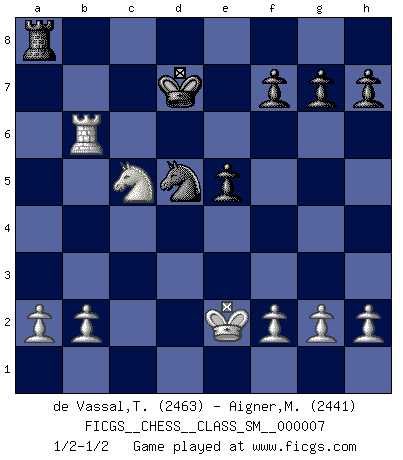 Last move : 1/2-1/2 2007 October 23 18:47:11 [Event "FICGS__CHESS__CLASS_SM__000007"] [Site "FICGS"] [Date "2007.07.05"] [Round "1"] [White "de Vassal,Thibault"] [Black "Aigner,Michael"] [Result "1/2-1/2"] [WhiteElo "2463"] [BlackElo "2441"] 1.e4 c5 2.Nf3 Nc6 3.d4 cxd4 4.Nxd4 e5 5.Nb5 a6 6.Nd6+ Bxd6 7.Qxd6 Qf6 8.Qd1 Qg6 9.Nc3 d5 10.Nxd5 Qxe4+ 11.Be3 Nd4 12.Nc7+ Ke7 13.Qd3 Nxc2+ 14.Kd2 Qxd3+ 15.Bxd3 Nxe3 16.Nxa8 Nd5 17.Rhc1 Ngf6 18.Nc7 Nb4 19.Rc4 Nxd3 20.Kxd3 Bd7 21.Rac1 Bc6 22.Rxc6 bxc6 23.Nxa6 Rd8+ 24.Ke2 Ra8 25.Rxc6 Kd7 26.Rb6 Nd5 27.Nc5+ 1/2-1/2 Sicilian : Labourdonnais-Loewenthal variation This chess game ended in a draw. Follow this game move after move (download)Fischer sacrificed virtually everything most of us weakies (to use his term) value, respect, and cherish, for the sake of an artful, often beautiful board game, for the ambivalent privilege of being its greatest master. (Paul Kollar) Es ist im Leben wie im Schachspiel. Wir entwerfen einen Plan, dieser bleibt jedoch bedingt durch das, was im Schachspiel dem Gegner, im Leben dem Schicksal zu tun belieben wird. (Arthur Schopenhauer) La táctica fluye a partir de una posición superior. (Bobby Fischer) Je menace de comprendre la position. (Anonyme) Kids, you tried your best and you failed miserably. The lesson is, never try. (Simpsons)