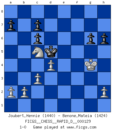 Last move : 1-0 2020 April 24 21:46:55 [Event "FICGS__CHESS__RAPID_D__000129"] [Site "FICGS"] [Date "2020.01.26"] [Round "1"] [White "Joubert,Hennie"] [Black "Benone,Mateia"] [Result "1-0"] [WhiteElo "1440"] [BlackElo "1424"] 1.e4 e5 2.Nf3 Nf6 3.Nxe5 d6 4.Nf3 Nxe4 5.c3 Be7 6.Qa4+ Nc6 7.Qxe4 O-O 8.d4 Re8 9.Be3 Bg5 10.Qd3 Bxe3 11.fxe3 Bg4 12.Nbd2 Qe7 13.e4 Bxf3 14.Qxf3 d5 15.Bd3 dxe4 16.Bxe4 g6 17.O-O f5 18.Bd5+ Kg7 19.Rfe1 Qg5 20.Nb3 Qf6 21.Bxc6 Qxc6 22.Qxc6 bxc6 23.Kf2 Kf7 24.Rxe8 Rxe8 25.Re1 Rxe1 26.Kxe1 Ke6 27.Ke2 Kd5 28.Nc5 Kc4 29.Ke3 Kd5 30.Kf4 h6 31.g4 fxg4 32.Kxg4 1-0 Petrov's defense Kingside Castling by player Black (move 7) Kingside Castling by player White (move 17) Player White won this chess game. Follow this game move after move (download)Whoever sees no other aim in the game than that of giving checkmate to one's opponent will never become a good Chess player. (Euwe) Wenn ich Weiß habe gewinne ich weil ich Weiß habe, wenn ich Schwarz habe gewinne ich weil ich Bogoljubov bin. (Efim Bogoljubov) En el tablero, la mentira e hipocresía no sobreviven mucho. (Emanuel Lasker) Le moment que je préfère le plus dans une rencontre, c'est celui où je sens que la personnalité de l'adversaire se brise. (Robert Fischer) Now you put water in a cup, it becomes the cup; You put water into a bottle it becomes the bottle; You put it in a teapot it becomes the teapot. Water can flow or it can crash. Be water, my friend. (Bruce Lee)