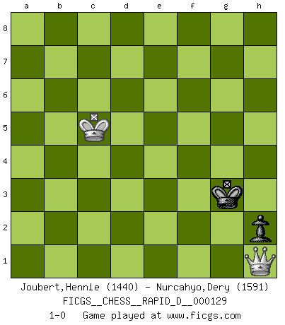 Last move : 1-0 2020 June 27 1:46:25 [Event "FICGS__CHESS__RAPID_D__000129"] [Site "FICGS"] [Date "2020.01.26"] [Round "1"] [White "Joubert,Hennie"] [Black "Nurcahyo,Dery"] [Result "1-0"] [WhiteElo "1440"] [BlackElo "1591"] 1.e4 e5 2.Nf3 d6 3.Bc4 c6 4.d4 exd4 5.c3 dxc3 6.Qb3 Qf6 7.O-O Nd7 8.Nxc3 Nc5 9.Qc2 h6 10.Bd2 b5 11.Bd3 Be6 12.Rfe1 Ne7 13.e5 dxe5 14.Nxe5 O-O-O 15.Nxb5 Rd5 16.Nxc6 Nxc6 17.Be4 Bf5 18.Bxf5+ Rxf5 19.Be3 Nb4 20.Qc4 a6 21.Nd4 Nbd3 22.Nxf5 Qxf5 23.Red1 Nxb2 24.Qc3 Nxd1 25.Rxd1 Be7 26.Rc1 Kb7 27.Bxc5 Rc8 28.Qb3+ Ka8 29.Rb1 Qd7 30.Qf3+ Qc6 31.Qxc6+ Rxc6 32.Bxe7 g5 33.h3 f5 34.Kf1 Re6 35.Bb4 Kb7 36.Ba5 Ka7 37.Re1 Rc6 38.f3 Kb7 39.a3 Kc8 40.Bb4 Kb7 41.Rd1 Kc7 42.Ba5+ Kc8 43.Rd8+ Kb7 44.Rd5 f4 45.Ke2 Rc2+ 46.Rd2 Rc5 47.Bb4 Re5+ 48.Kd1 h5 49.Bd6 Re6 50.Rd5 Kc6 51.Re5 Rxd6+ 52.Kc2 Rd5 53.Rxd5 Kxd5 54.Kd3 Ke5 55.Kc4 Kf5 56.Kd5 g4 57.h4 a5 58.a4 gxf3 59.gxf3 Kf6 60.Ke4 Ke6 61.Kxf4 Kf6 62.Ke4 Ke6 63.f4 Kf6 64.Kd5 Kf5 65.Kc5 Kxf4 66.Kb5 Kg4 67.Kxa5 Kxh4 68.Kb6 Kg3 69.a5 h4 70.a6 h3 71.a7 h2 72.a8Q Kf2 73.Qh1 Kg3 74.Kc5 1-0 Philidor's defense Kingside Castling by player White (move 7) Queenside Castling by player Black (move 14) 10 pieces endgame at move 53 : White KPPPP , Black KPPPP WHITE : King + 4 Pawns BLACK : King + 4 Pawns 9 pieces endgame at move 58 : White KPPP , Black KPPPP WHITE : King + 3 Pawns BLACK : King + 4 Pawns 8 pieces endgame at move 59 : White KPPP , Black KPPP WHITE : King + 3 Pawns BLACK : King + 3 Pawns 7 pieces endgame at move 61 : White KPPP , Black KPP WHITE : King + 3 Pawns BLACK : King + 2 Pawns 6 pieces endgame at move 65 : White KPP , Black KPP WHITE : King + 2 Pawns BLACK : King + 2 Pawns 5 pieces endgame at move 67 : White KPP , Black KP WHITE : King + 2 Pawns BLACK : King + 1 Pawn 4 pieces endgame at move 67 : White KP , Black KP WHITE : King + 1 Pawn BLACK : King + 1 Pawn Promotion Queen by player White (move 72) Player White won this chess game. Follow this game move after move (download)You must take your opponent into a deep dark forest where 2+2=5, and the path leading out is only wide enough for one. (Mikhail Tal) Wer wird heute Abend ihr Gegner sein? -- Heute Abend spiele ich gegen die schwarzen Steine. (Akiba Rubinstein) a manera como él juega al Ajedrez, demuestra la completa naturaleza de un hombre. (Stanley Ellin) La vie et les Echecs sont tous les deux une lutte constante. (Lasker) That's absurd. I love it. (Gregory House, House M.D.)