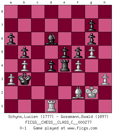 Last move : 0-1 2020 March 2 17:41:50 [Event "FICGS__CHESS__CLASS_C__000277"] [Site "FICGS"] [Date "2020.01.27"] [Round "1"] [White "Schyns,Lucien"] [Black "Gossmann,Ewald"] [Result "0-1"] [WhiteElo "1777"] [BlackElo "1897"] 1.d4 d5 2.Nf3 Nf6 3.Bf4 Bf5 4.e3 e6 5.Bb5+ Nbd7 6.O-O Be7 7.Nh4 Be4 8.f3 Bg6 9.Nxg6 hxg6 10.h3 a6 11.Bxd7+ Qxd7 12.Nc3 c5 13.Qd2 O-O 14.Nd1 Nh5 15.Bh2 Rac8 16.Nf2 Bd6 17.f4 cxd4 18.exd4 Qc7 19.Nd3 Qxc2 20.Qd1 Qxd1 21.Rfxd1 Rc4 22.g4 Nf6 23.Rac1 Rxd4 24.b3 Re4 25.Rc2 Re3 26.Nf2 Ne4 27.Nxe4 Rxe4 28.Rf1 d4 29.Kg2 f5 30.g5 Rd8 31.Rf3 Kf7 32.Bg3 Rd7 33.Rb2 Rc7 34.b4 b5 35.a3 Ke7 36.Rd2 Rc4 37.Rdf2 Kd7 38.Rb2 Kc6 39.Ra2 Rc1 40.Rd2 Kd5 41.Bf2 Kc4 42.Rfd3 e5 43.Rd1 Rxd1 44.Rxd1 Kb3 0-1 Queen's Bishop game Kingside Castling by player White (move 6) Kingside Castling by player Black (move 13) Player Black won this chess game. Follow this game move after move (download)Via the squares on the chessboard, the Indians explain the movement of time and the age, the higher influences which control the world and the ties which link Chess with the human soul. (Al-Masudi) Ein Teil des Fehlers ist immer korrekt. (Savielly Grigorievitsch Tartakower) El Ajedrez es un expediente tonto que hace creer a la gente inactiva que hacen una cosa muy astuta cuando solamente estan perdiendo su tiempo. (George Bernard Shaw) Les Echecs représentent une sphère d'idées créatrices basée sur la volonté des deux protagonistes. (Smyslov) There is a very easy way to return from a casino with a small fortune : go there with a large one. (Jack Yelton)