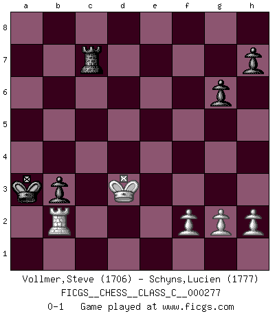 Last move : 0-1 2020 March 5 10:46:39 [Event "FICGS__CHESS__CLASS_C__000277"] [Site "FICGS"] [Date "2020.01.27"] [Round "1"] [White "Vollmer,Steve"] [Black "Schyns,Lucien"] [Result "0-1"] [WhiteElo "1706"] [BlackElo "1777"] 1.d4 g6 2.c4 Bg7 3.Nc3 Nf6 4.e4 O-O 5.e5 Ne8 6.Nf3 Nc6 7.Bd3 d6 8.exd6 Bg4 9.dxc7 Qxc7 10.O-O Bxd4 11.Nb5 Qb6 12.Nbxd4 Nxd4 13.Be2 Rd8 14.Nxd4 Rxd4 15.Qc2 Bxe2 16.Qxe2 Nf6 17.Be3 Qe6 18.Rfe1 Rxc4 19.Bxa7 Rfc8 20.Qxe6 fxe6 21.Rxe6 Rc1+ 22.Re1 Rxe1+ 23.Rxe1 Ra8 24.Bc5 Rxa2 25.Bxe7 Nd5 26.Ba3 b5 27.Bc5 Rxb2 28.Kf1 Rc2 29.Be3 b4 30.Rb1 Kf7 31.Rb3 Ke7 32.Ke1 Nxe3 33.Rxe3+ Kd6 34.Rd3+ Kc5 35.Rd2 Rc3 36.Rb2 b3 37.Ke2 Kb4 38.Kd2 Rc7 39.Kd3 Ka3 0-1 Modern defense Kingside Castling by player Black (move 4) Kingside Castling by player White (move 10) 10 pieces endgame at move 33 : White KRPPP , Black KRPPP WHITE : King + 1 Rook 3 Pawns BLACK : King + 1 Rook 3 Pawns Player Black won this chess game. Follow this game move after move (download)Nowadays, when you're not a grandmaster at 14, you can forget about it. (Anand Viswanathan) Obwohl ich alt bin, darf mir niemand den Finger in den Mund stecken, sonst beisse ich. (Wilhelm Steinitz) Nunca antes ha habido un jugador de Ajedrez con tal conocimiento a fondo de las complejidades del juego y una inmensa voluntad absolutamente indomable de ganar. Yo pienso que Fischer es el jugador mas grande que jamás haya existido. (Lisa Lane) Même un GMI sait rarement calculer sur plus de cinq coups une attaque à sacrifices. (Rudolf Spielmann) Patience, use the Force, think ! (Obi-Wan Kenobi in Star Wars ep.2)