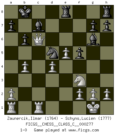 Last move : 1-0 2020 February 11 10:16:24 [Event "FICGS__CHESS__CLASS_C__000277"] [Site "FICGS"] [Date "2020.01.27"] [Round "1"] [White "Zaunercik,Ilmar"] [Black "Schyns,Lucien"] [Result "1-0"] [WhiteElo "1764"] [BlackElo "1777"] 1.e4 c6 2.d4 d5 3.e5 Bf5 4.Nf3 e6 5.Be2 Bb4+ 6.c3 Be7 7.O-O Nd7 8.Nbd2 Qc7 9.Re1 Bg6 10.Nf1 O-O-O 11.c4 dxc4 12.Ne3 Bb4 13.Bd2 Qa5 14.Nxc4 Bxd2 15.Nxa5 Bxa5 16.Rf1 f5 17.Bc4 Re8 18.Qb3 Nf8 19.Rfc1 Ne7 20.Bxe6+ Nxe6 21.Qxe6+ Kb8 22.b4 Nd5 23.Qd6+ Bc7 24.Qc5 b6 25.Qxc6 1-0 Caro-Kann : Advance variation Kingside Castling by player White (move 7) Queenside Castling by player Black (move 10) Player White won this chess game. Follow this game move after move (download)I play correspondence chess because it is both art and science while chess is art only. (A player at FICGS) Ich spiele 70 Eröffnungssysteme. (Viktor Kortschnoi) El jugador de combinación piensa hacia adelante; comienza de la posición dada y trabaja las movidas contundentes en su mente. (Emanuel Lasker) Même si l'adversaire joue le coup analysé précédemment, recommencez l'analyse en voyant la nouvelle position. Première règle de Blumenfeld A proverb is a short sentence based on long experience. (Miguel de Cervantes)
