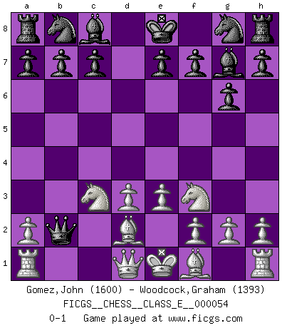 Last move : 0-1 2007 September 10 1:41:27 [Event "FICGS__CHESS__CLASS_E__000054"] [Site "FICGS"] [Date "2007.07.05"] [Round "1"] [White "Gomez,John"] [Black "Woodcock,Graham"] [Result "0-1"] [WhiteElo "1600"] [BlackElo "1393"] 1.Nf3 d5 2.e3 g6 3.c4 Bg7 4.cxd5 Qxd5 5.d3 Qa5+ 6.Bd2 Qb5 7.Nc3 Qxb2 0-1 This chess game has been lost on time (started : 2007.07.05 20:7:2) Reti Opening Player Black won this chess game. Follow this game move after move (download)The chessboard is the world, the pieces are the phenomena of the Universe, the rules of the game are what we call the laws of Nature and the player on the other side is hidden from us. (Thomas Huxley) Modernes Schach sorgt sich zuviel um Dinge wie Bauernstruktur usw. Vergessen Sie das, Schachmatt beendet das Spiel! (Nigel Short) Los errores estan ahí, esperando a que se cometan. (Savielly Tartakower) Le joueur d'Echecs qui veut atteindre le top est obligé de développer son propre credo créatif. Alexeï Stepanovicth Souétine. Il est facile d'écrire des livres ! Ce qui est difficile, c'est de jouer ! (Alexeï Stepanovicth Souétine) A mistake is only a mistake if you let it happen twice. Otherwise it is a learning experience. (Daniel Parmet)
