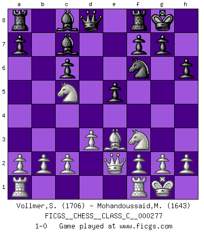 Last move : 1-0 2020 April 18 3:39:58 [Event "FICGS__CHESS__CLASS_C__000277"] [Site "FICGS"] [Date "2020.01.27"] [Round "1"] [White "Vollmer,Steve"] [Black "Mohandoussaid,Malik"] [Result "1-0"] [WhiteElo "1706"] [BlackElo "1643"] 1.e4 d5 2.exd5 c6 3.dxc6 Nxc6 4.Nf3 e5 5.Nc3 Nf6 6.Bb5 Bd6 7.O-O Bd7 8.d3 h6 9.Be3 O-O 10.Ne4 Bc7 11.Nc5 Bc8 12.Bxc6 bxc6 13.Qe2 1-0 This chess game has been lost on time (started : 2020.01.27 23:24:30) Scandinavian (centre counter) defense Kingside Castling by player White (move 7) Kingside Castling by player Black (move 9) Player White won this chess game. Follow this game move after move (download)Mistrust is the most necessary characteristic of the Chess player. (Siegbert Tarrasch) Über die Verhaftung Bobby Fischers: Warum es die Bush-Administration für nötig befindet einen 61 Jahre alten Mann zu hetzten, der für niemanden ausser sich selbste eine Gefahr darstellt ist ein Rätsel. (Nigel Short) Cada Peón es una Reina en potencia. (James Mason) Les pièces de l'échiquier étaient impitoyables. Elles le retenaient, elles l'absorbaient. Il y avait de l'horreur en cela, mais aussi une harmonie unique. Car, qu'y a-t-il dans le monde, à part les échecs ? (V. Nabokov) If everyone is thinking alike, then somebody isn't thinking. (US General George S. Patton)