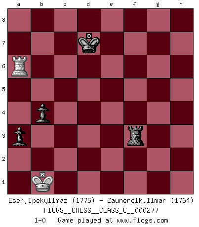 Last move : 1-0 2020 September 15 23:25:24 [Event "FICGS__CHESS__CLASS_C__000277"] [Site "FICGS"] [Date "2020.01.27"] [Round "1"] [White "Eser,Ipekyilmaz"] [Black "Zaunercik,Ilmar"] [Result "1-0"] [WhiteElo "1775"] [BlackElo "1764"] 1.a3 e5 2.g3 d5 3.Bg2 Nc6 4.d3 Be7 5.h3 Nf6 6.Bg5 O-O 7.Bxf6 Bxf6 8.h4 Be6 9.h5 Qe7 10.h6 g6 11.Kd2 Bg5+ 12.e3 d4 13.Ke2 Qc5 14.e4 f5 15.Nd2 f4 16.gxf4 exf4 17.Ngf3 Bg4 18.Rc1 Ne5 19.c3 Qb5 20.Qc2 dxc3 21.bxc3 Rad8 22.c4 Qd7 23.Kf1 Nxf3 24.Bxf3 Bxf3 25.Nxf3 Bf6 26.Rd1 g5 27.d4 g4 28.Nh2 g3 29.fxg3 fxg3 30.Nf3 Bxd4 31.Rd3 Qg4 32.Kg2 Qxe4 33.Rh4 Qg6 34.Rd2 Bf6 35.Rh3 Kh8 36.Qxg6 Rxd2+ 37.Nxd2 hxg6 38.Kxg3 Rd8 39.Nf3 Rd3 40.h7 Rxa3 41.Rh6 Ra6 42.Kf4 Bg7 43.Rh1 Rc6 44.Ng5 Rf6+ 45.Kg4 a5 46.Rb1 b6 47.c5 Bh6 48.cxb6 cxb6 49.Rh1 Bxg5 50.Kxg5 Rc6 51.Rd1 Kxh7 52.Rd7+ Kg8 53.Kf4 a4 54.Ra7 b5 55.Kg5 Rc8 56.Kxg6 Rb8 57.Kf5 Rb6 58.Ke4 Rh6 59.Kd3 Rh7 60.Ra5 Rh3+ 61.Kc2 Rb3 62.Ra7 Kf8 63.Rd7 Ke8 64.Rc7 Kd8 65.Rf7 Kc8 66.Rg7 Rf3 67.Kb1 a3 68.Rg8+ Kd7 69.Rg6 b4 70.Ra6 1-0 Anderssen's Opening Kingside Castling by player Black (move 6) 10 pieces endgame at move 48 : White KRNP , Black KRBPPP WHITE : King + 1 Rook 1 Knight 1 Pawn BLACK : King + 1 Rook 1 Bishop 3 Pawns 9 pieces endgame at move 49 : White KRP , Black KRBPPP WHITE : King + 1 Rook 1 Pawn BLACK : King + 1 Rook 1 Bishop 3 Pawns 8 pieces endgame at move 50 : White KRP , Black KRPPP WHITE : King + 1 Rook 1 Pawn BLACK : King + 1 Rook 3 Pawns 7 pieces endgame at move 51 : White KR , Black KRPPP WHITE : King + 1 Rook BLACK : King + 1 Rook 3 Pawns 6 pieces endgame at move 56 : White KR , Black KRPP WHITE : King + 1 Rook BLACK : King + 1 Rook 2 Pawns Player White won this chess game. Follow this game move after move (download)Botvinnik tried to take the mystery out of Chess, always relating it to situations in ordinary life. He used to call Chess a typical inexact problem similar to those which people are always having to solve in everyday life. (Garry Kasparov) Über Karpov: Er war und ist ein Vertreter der russischen Reaktionäre. Das steckt tief in seiner Seele, wehalb ich nicht nett mit ihm umgehen kann. (Viktor Kortschnoi) Por tratar de evitar la pérdida de una pieza, muchas personas han perdido una partida de Ajedrez. (Savielly Tartakover) Il n'y a pas de prix trop élevé au scalp de l'ennemi. (Koblentz) I'm extremely disappointed. I send you out for exciting, new designer drugs, you come back with tomato sauce. (Gregory House, House M.D.)