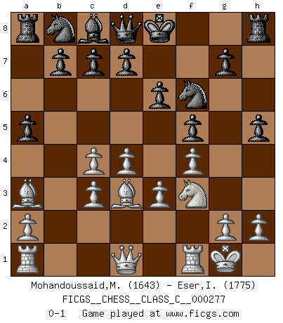 Last move : 0-1 2020 May 1 23:53:17 [Event "FICGS__CHESS__CLASS_C__000277"] [Site "FICGS"] [Date "2020.01.27"] [Round "1"] [White "Mohandoussaid,Malik"] [Black "Eser,Ipekyilmaz"] [Result "0-1"] [WhiteElo "1643"] [BlackElo "1775"] 1.d4 f6 2.f4 f5 3.Nf3 Nf6 4.e3 e6 5.c4 a6 6.Nc3 Bb4 7.Bd3 a5 8.O-O Bxc3 9.bxc3 h6 10.Ba3 h5 0-1 This chess game has been lost on time (started : 2020.01.27 23:24:30) Queen's pawn Kingside Castling by player White (move 8) Player Black won this chess game. Follow this game move after move (download)Pawns: they are the soul of this game, they alone form the attack and defense. (Philidor) Schachspieler können ausgezeichnet Varianten am Schachbrett berechnen, aber nicht im realen Leben. Zu stark ist der Individualismus im Schach ausgeprägt, und für viele ist ein kleiner momentaner persönlicher Vorteil wichtiger als ein weit größerer Vorteil von morgen. (Anatoly Karpov) El Ajedrez era la lengua materna de Capablanca. (Reti) Donnez-moi un Cavalier en 6e et je gagnerais toutes mes parties. (Steinitz) The faster the computer, the slower the brain. (Thibault de Vassal)