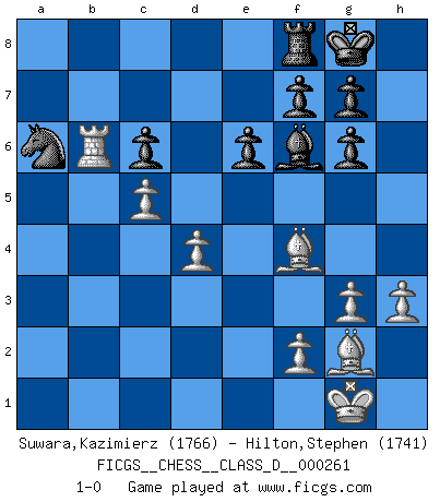 Last move : 1-0 2020 May 23 22:23:16 [Event "FICGS__CHESS__CLASS_D__000261"] [Site "FICGS"] [Date "2020.01.27"] [Round "1"] [White "Suwara,Kazimierz"] [Black "Hilton,Stephen"] [Result "1-0"] [WhiteElo "1766"] [BlackElo "1741"] 1.e4 Nf6 2.e5 Nd5 3.d4 d6 4.Nf3 c6 5.g3 Bg4 6.Bg2 e6 7.exd6 Bxd6 8.h3 Bh5 9.O-O Nd7 10.c4 N5f6 11.c5 Be7 12.Re1 O-O 13.b4 Nd5 14.Bd2 Bg6 15.Qb3 N7f6 16.Ne5 Nd7 17.Nxg6 hxg6 18.a4 a6 19.b5 axb5 20.Nc3 Nxc3 21.Bxc3 bxa4 22.Rxa4 Rxa4 23.Qxa4 Qb8 24.Rb1 Qc7 25.Qa5 Qxa5 26.Bxa5 Bd8 27.Bd2 Bf6 28.Rxb7 Nb8 29.Bf4 Na6 30.Rb6 1-0 Alekhine's defense : Modern variation Kingside Castling by player White (move 9) Kingside Castling by player Black (move 12) Player White won this chess game. Follow this game move after move (download)Personally, I rather look forward to a computer program winning the world Chess Championship. Humanity needs a lesson in humility. (Richard Dawkings) Im Internet Chess Club betrug mein Rating vorübergehend 3350 ELO-Punkte. (Sergej Karjakin) Si un gobernante no entiende al Ajedrez, ¿como puede governar él un reinado?. (El Rey Khusros II) Les Cavaliers se révèlent fort utiles dans les positions fermées. D'habitude, les Fous sont un peu plus forts que les Cavaliers dans les positions ouvertes. Qu'on le veuille ou non, il restera toujours des exceptions ! A good book on your shelf is a friend that turns its back on you and remains a friend. (Author unknown)