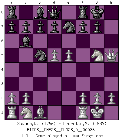 Last move : 1-0 2020 February 12 9:5:1 [Event "FICGS__CHESS__CLASS_D__000261"] [Site "FICGS"] [Date "2020.01.27"] [Round "1"] [White "Suwara,Kazimierz"] [Black "Leurette,Marc-Antoine"] [Result "1-0"] [WhiteElo "1766"] [BlackElo "1539"] 1.e4 e5 2.Nf3 Nc6 3.Bb5 Nf6 4.O-O Bc5 5.c3 O-O 6.d4 exd4 7.cxd4 Bb6 8.e5 Ne4 9.d5 Ne7 10.Bd3 Nc5 11.Bxh7+ Kxh7 12.Ng5+ Kg8 13.Qh5 1-0 Ruy Lopez : Berlin defense, Beverwijk variation Kingside Castling by player White (move 4) Kingside Castling by player Black (move 5) Player White won this chess game. Follow this game move after move (download)You have to have the fighting spirit. You have to force moves and take chances. (Bobby Fischer) Die größte Kunst beim Schach besteht darin dem Gegner nicht zu zeigen was er tun kann. (Garry Kasparov) Si tu oponente no puede hacer nada activo, entonces no apures la posición; En vez de eso, dejalo estar sentado ahí, sufriendo y rogandote por un empate. (Jeremy Silman) Botvinnik disait en comparant les échecs à la musique: Il existe une science dont le but est l'étude de l'acoustique et des sons. Mais il y a aussi un art qui se sert de l'océan des sons : c'est la musique. De toute évidence, il en est de même pour la pensée. La logique est l'étude des lois de la réflexion et les échecs reflètent, en tant qu'art, le côté logique de la réflexion, sous la forme d'images artistiques... Extrait de Fischer - Spassky, Reykjavik 1972 par Alexander & F. Wyndham (Ed. Solar), p 37. A good aphorism is too hard for the tooth of time, and is not worn away with the centuries, although it serves as food for every speech. (Friedrich Nietzsche)
