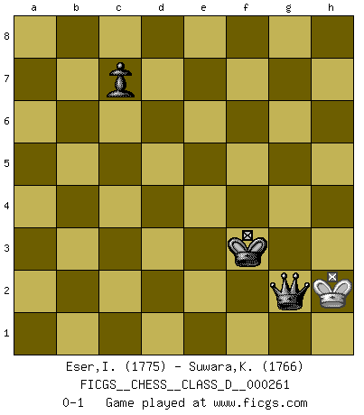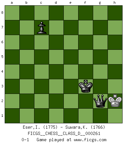 Last move : 0-1 2021 July 8 19:54:56 [Event "FICGS__CHESS__CLASS_D__000261"] [Site "FICGS"] [Date "2020.01.27"] [Round "1"] [White "Eser,Ipekyilmaz"] [Black "Suwara,Kazimierz"] [Result "0-1"] [WhiteElo "1775"] [BlackElo "1766"] 1.a3 g6 2.g3 Bg7 3.Bg2 e5 4.d3 Ne7 5.h3 d5 6.h4 h6 7.Nh3 Nbc6 8.a4 f6 9.Na3 Be6 10.Bd2 Qd7 11.e3 O-O-O 12.a5 a6 13.b3 Qd6 14.Qb1 g5 15.b4 gxh4 16.gxh4 h5 17.b5 Nb8 18.Ng1 Rhg8 19.Ne2 Bh6 20.Bf3 Bg4 21.Bxg4+ Rxg4 22.Qb3 Nf5 23.Rb1 Bf8 24.f3 Rxh4 25.Rxh4 Nxh4 26.bxa6 Qxa6 27.Kf2 Nf5 28.f4 Nc6 29.Qa4 Bxa3 30.Qxa3 h4 31.Qc5 e4 32.Qc3 d4 33.Nxd4 Ncxd4 34.Rb6 Qa7 35.exd4 h3 36.Qc5 Nxd4 37.f5 h2 38.Bf4 Nb5 39.Rxb5 h1Q 40.Qxa7 Qf3+ 41.Ke1 exd3 42.Qxb7+ Qxb7 43.Rxb7 Kxb7 44.cxd3 Rxd3 45.Ke2 Rd5 46.a6+ Kc6 47.a7 Ra5 48.Bd2 Rxa7 49.Bc3 Ra2+ 50.Kd3 Ra3 51.Kd2 Rxc3 52.Kxc3 Kd5 53.Kd3 Ke5 54.Ke3 Kxf5 55.Kf3 Ke5 56.Ke3 f5 57.Kf2 Ke4 58.Ke2 f4 59.Kf2 f3 60.Ke1 Ke3 61.Kf1 f2 62.Kg2 Ke2 63.Kg3 f1Q 64.Kg4 Qf6 65.Kg3 Qg5+ 66.Kh3 Kf3 67.Kh2 Qg2+ 0-1 Follow this game move after move (download)One of these modest little moves may be more embarrassing to your opponent than the biggest threat. (Siegbert Tarrasch) Wenn ich einen Club besuche, sind die Spieler stumm vor Staunen. (José Raúl Capablanca) Cuando le juegas a Fischer, no es una cuestion de si vas a ganar o perder. Es una cuestion de si vas a sobrevivir. (Boris Spassky) On a dit que l'homme se distingue de l'animal par le fait qu'il achète plus de livres qu'il ne peut en lire. Je voudrais suggérer qu'inclure à la liste des livres quelques livres d'échecs rendrait la distinction manifeste. (Edward Lasker) Do not put your faith in what statistics say until you have carefully considered what they do not say. (William W. Watt)