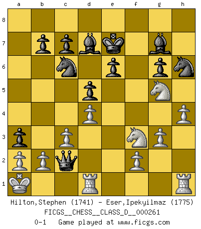 Last move : 0-1 2020 February 29 22:22:45 [Event "FICGS__CHESS__CLASS_D__000261"] [Site "FICGS"] [Date "2020.01.27"] [Round "1"] [White "Hilton,Stephen"] [Black "Eser,Ipekyilmaz"] [Result "0-1"] [WhiteElo "1741"] [BlackElo "1775"] 1.e4 f6 2.d4 a6 3.Bd3 a5 4.e5 e6 5.Qh5+ g6 6.Bxg6+ hxg6 7.Qxh8 Kf7 8.Qh7+ Bg7 9.Bh6 Nxh6 10.exf6 Qxf6 11.Nf3 Nc6 12.c3 d6 13.Nbd2 d5 14.h4 Bd7 15.Ng5+ Ke7 16.O-O-O Rh8 17.Ndf3 Rxh7 18.Nxh7 Qf4+ 19.Kb1 a4 20.Nhg5 a3 21.g3 Qf5+ 22.Ka1 Qc2 0-1 Barnes defense Queenside Castling by player White (move 16) Player Black won this chess game. Follow this game move after move (download)Chess mastery essentially consists of analyzing Chess positions accurately. (Mikhail Botvinnik) Ich erzeugte keinen Neid, da mich die Schachspieler als Musiker und die Musiker als Schachspieler betrachteten. (Mark Taimanov) Aquel que toma al Peón de Caballo de la Reina, se pasará la noche a dormir en la calle. (Anónimo) Les échecs sont utiles à l'exercice de la faculté de penser et à celle de l'imagination. Car nous devons posséder une méthode élaborée pour atteindre des buts partout où nous devons conduire notre raison. (Leibnitz) The ego is not master in its own house. (Sigmund Freud)