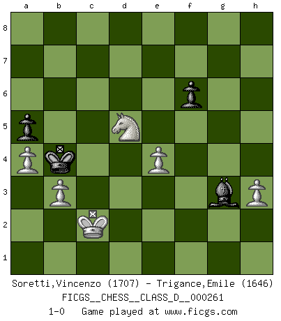 Last move : 1-0 2020 April 22 15:51:56 [Event "FICGS__CHESS__CLASS_D__000261"] [Site "FICGS"] [Date "2020.01.27"] [Round "1"] [White "Soretti,Vincenzo"] [Black "Trigance,Emile"] [Result "1-0"] [WhiteElo "1707"] [BlackElo "1646"] 1.Nf3 d5 2.d4 Nf6 3.c4 c6 4.e3 Bf5 5.Bd3 e6 6.O-O Bxd3 7.Qxd3 dxc4 8.Qxc4 Nbd7 9.Nc3 Nb6 10.Qb3 Be7 11.a4 a5 12.e4 O-O 13.Bg5 h6 14.Be3 Nfd7 15.d5 exd5 16.exd5 Qc7 17.Rac1 Bb4 18.Nb5 Qb8 19.dxc6 bxc6 20.Rxc6 Rc8 21.Rxc8+ Nxc8 22.Rd1 Qb7 23.Nd6 Nxd6 24.Rxd6 Rb8 25.Rd3 Nc5 26.Bxc5 Bxc5 27.Qxb7 Rxb7 28.b3 Rb8 29.Kf1 Bb4 30.Ke2 Re8+ 31.Kd1 Kf8 32.Re3 Rxe3 33.fxe3 Ke7 34.Kc2 Kd6 35.e4 g6 36.Kd3 Ke6 37.Nd4+ Kd6 38.g4 f6 39.Nc2 Kc5 40.h3 h5 41.Ne3 Be1 42.gxh5 gxh5 43.Nd5 Bh4 44.Nf4 Kb4 45.Kc2 Bg5 46.Nxh5 Bh4 47.Nf4 Bg3 48.Nd5+ 1-0 Reti Opening Kingside Castling by player White (move 6) Kingside Castling by player Black (move 12) 10 pieces endgame at move 46 : White KNPPPP , Black KBPP WHITE : King + 1 Knight 4 Pawns BLACK : King + 1 Bishop 2 Pawns Player White won this chess game. Follow this game move after move (download)I played Chess with him and would have beaten him sometimes only he always took back his last move, and ran the game out differently. (Mark Twain) Wenn ich gewinne bin ich ein Genie. Wenn nicht, dann bin ich keines. (Robert James Fischer) Hoy en día, si tu no eres un Gran Maestro a los 14 años, es mejor que lo olvides. (Anand Viswanathan) Votre seul travail dans les ouvertures est d'obtenir un milieu de partie jouable. (Lajos Portish) Macintosh - we might not get everything right, but at least we knew the century was going to end. (Douglas Adams)