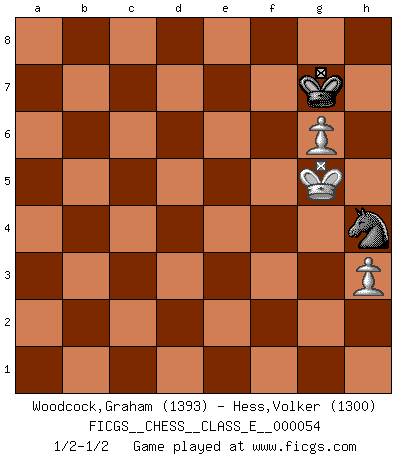 Last move : 1/2-1/2 2007 September 20 14:23:54 [Event "FICGS__CHESS__CLASS_E__000054"] [Site "FICGS"] [Date "2007.07.05"] [Round "1"] [White "Woodcock,Graham"] [Black "Hess,Volker"] [Result "1/2-1/2"] [WhiteElo "1393"] [BlackElo "1300"] 1.d4 f5 2.c4 Nf6 3.g3 e6 4.Bg2 Be7 5.c5 O-O 6.Nf3 c6 7.Nc3 d5 8.cxd6 Bxd6 9.Qb3 Na6 10.Ng5 Be7 11.Nxe6 Bxe6 12.Qxe6+ Kh8 13.O-O Nd5 14.Nxd5 cxd5 15.Bxd5 Nc7 16.Qe5 Nxd5 17.e4 fxe4 18.Qxe4 Nb6 19.Qxb7 Bg5 20.Rd1 Bxc1 21.Raxc1 Rc8 22.Rxc8 Nxc8 23.a4 Qb6 24.Qxb6 Nxb6 25.a5 Nc4 26.b4 Rb8 27.Re1 h6 28.Re7 Rxb4 29.Rxa7 Ra4 30.Kg2 Rxa5 31.Rxa5 Nxa5 32.Kf3 Kg8 33.Ke4 Kf7 34.f4 h5 35.d5 Kf6 36.h3 g6 37.g4 h4 38.g5+ Ke7 39.f5 gxf5+ 40.Kxf5 Nc4 41.Kg4 Ne3+ 42.Kxh4 Nxd5 43.Kg4 Kf7 44.Kf5 Ne3+ 45.Kf4 Ng2+ 46.Kf5 Kg7 47.g6 Nh4+ 48.Kg5 1/2-1/2 Dutch defense Kingside Castling by player Black (move 5) Kingside Castling by player White (move 13) 10 pieces endgame at move 31 : White KRPPPP , Black KNPP WHITE : King + 1 Rook 4 Pawns BLACK : King + 1 Knight 2 Pawns 9 pieces endgame at move 31 : White KPPPP , Black KNPP WHITE : King + 4 Pawns BLACK : King + 1 Knight 2 Pawns 8 pieces endgame at move 39 : White KPPP , Black KNPP WHITE : King + 3 Pawns BLACK : King + 1 Knight 2 Pawns 7 pieces endgame at move 40 : White KPPP , Black KNP WHITE : King + 3 Pawns BLACK : King + 1 Knight 1 Pawn 6 pieces endgame at move 42 : White KPPP , Black KN WHITE : King + 3 Pawns BLACK : King + 1 Knight 5 pieces endgame at move 42 : White KPP , Black KN WHITE : King + 2 Pawns BLACK : King + 1 Knight This chess game ended in a draw. Follow this game move after move (download)Chess is mental torture. (Garry Kasparov) Wir können eben der zündenden Macht des Opfers nicht wiederstehen, denn die Begeisterung für das Opfer liegt in der Natur des Menschen. (Rudolf Spielmann) Me gusta decir que Bobby Fischer fue el mejor jugador que jamás haya existido. Pero lo que hizo de Fischer un genio, fue su habilidad de mezclar una frescura y pragmatismo Americano con ideas Rusas acerca de la estrategia. (Bruce Pandolfini) Demandez au pauvre Cg1 ce qu'il en pense. Eduard Gufeld à propos de la variante Saemisch de l'Est-Indienne. Chess, like love, like music, has the power to make people happy. (Siegbert Tarrasch)