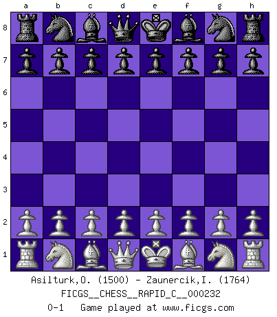 Last move : 0-1 2020 March 1 15:22:19 [Event "FICGS__CHESS__RAPID_C__000232"] [Site "FICGS"] [Date "2020.01.31"] [Round "1"] [White "Asilturk,Oguzhan"] [Black "Zaunercik,Ilmar"] [Result "0-1"] [WhiteElo "1500"] [BlackElo "1764"] 0-1 This chess game has been lost on time (started : 2020.01.31 11:49:55) Player Black won this chess game. Follow this game move after move (download)Chess is in its essence a game, in its form an art, and in its execution a science. (Baron Tassilo) Zum Sieg gelangt man nicht, wenn man gut, sondern nur wenn man besser spielt (Savielly Grigorievitsch Tartakower) En partidas rápidas, el Caballo es mas poderoso que el Alfil. (Vlastimil Hort) La vérité est comme le meilleur coup aux échecs : elle existe, mais il faut la chercher. (Arturo Perez-Reverte) Pretend inferiority and encourage his arrogance. (Sun Tzu)
