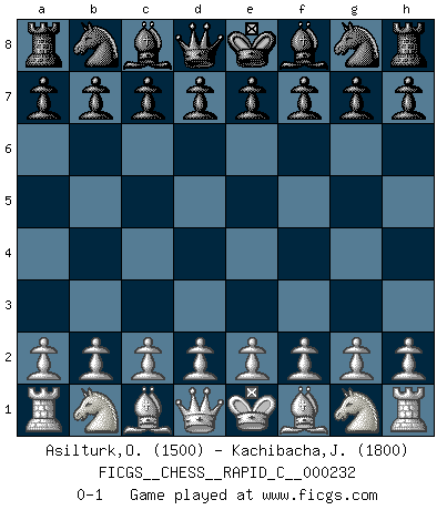 Last move : 0-1 2020 March 1 15:22:19 [Event "FICGS__CHESS__RAPID_C__000232"] [Site "FICGS"] [Date "2020.01.31"] [Round "1"] [White "Asilturk,Oguzhan"] [Black "Kachibacha,Jobadi"] [Result "0-1"] [WhiteElo "1500"] [BlackElo "1800"] 0-1 This chess game has been lost on time (started : 2020.01.31 11:49:55) Player Black won this chess game. Follow this game move after move (download)The passed Pawn is a criminal, who should be kept under lock and key. Mild measures, such as police surveillance, are not sufficient. (Aaron Nimzovich) Ein Remis kann durch Wiederholung von drei Zügen oder durch einen schlechte Zug erreicht werden. (Savielly Grigorievitsch Tartakower) Aquel que toma al Peón de Caballo de la Reina, se pasará la noche a dormir en la calle. (Anónimo) On a dit que l'homme se distingue de l'animal par le fait qu'il achète plus de livres qu'il ne peut en lire. Je voudrais suggérer qu'inclure à la liste des livres quelques livres d'échecs rendrait la distinction manifeste. (Edward Lasker) Coffee just isn't my cup of tea. (Unknown)
