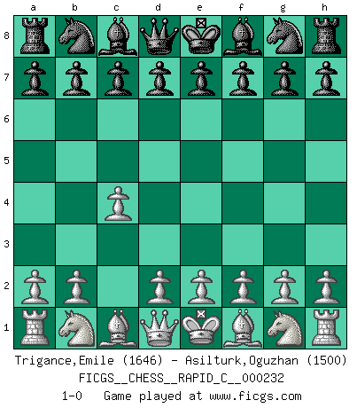 Last move : 1-0 2020 March 5 13:6:6 [Event "FICGS__CHESS__RAPID_C__000232"] [Site "FICGS"] [Date "2020.01.31"] [Round "1"] [White "Trigance,Emile"] [Black "Asilturk,Oguzhan"] [Result "1-0"] [WhiteElo "1646"] [BlackElo "1500"] 1.c4 1-0 This chess game has been lost on time (started : 2020.01.31 11:49:55) English Opening Player White won this chess game. Follow this game move after move (download)The only thing Chess players have in common is Chess. (Lodewijk Prins) Garry Kasparov war erst in der Großmeister-Organisation GMA, dann in der Profischach-Vereinigung PCA, zum Schluss kehrte er wieder in den Schoß der FIDE zurück. Aber gut, manche Leute sind flexibel (Viswanathan Anand) Los problemas de Ajedrez exigen del compositor las mismas virtudes que caracterizan todo el arte de valor: originalidad, invención, concisión, armonía, complejidad e insinceridad explendida. (Vladimir Nabokov) Plusieurs personnes se sont demandées comment Tal faisait pour gagner... En fait, c'est très simple ! Il met ses pièces au centre de l'échiquier et les sacrifie quelque part ! (David Bronstein) There are lots of people who mistake their imagination for their memory. (Josh Bilings)