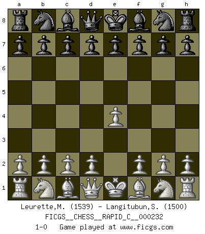 Last move : 1-0 2020 March 1 15:22:19 [Event "FICGS__CHESS__RAPID_C__000232"] [Site "FICGS"] [Date "2020.01.31"] [Round "1"] [White "Leurette,Marc-Antoine"] [Black "Langitubun,Sebastianus Vincentius"] [Result "1-0"] [WhiteElo "1539"] [BlackElo "1500"] 1.e4 1-0 This chess game has been lost on time (started : 2020.01.31 11:49:55) King's pawn Opening Player White won this chess game. Follow this game move after move (download)The way he plays Chess demonstrates a man's whole nature. (Stanley Ellin) Schach ist eine Sache der genauen Beurteilung, wann man zuschlagen und wann man sich ducken muss. (Robert James Fischer) El Ajedrez, como la música, como el amor, tiene el poder de hacer feliz a la gente. (Siegbert Tarrasch) Les échecs sont un jeu terrible. Si vous n'avez pas le centre, votre adversaire a une position plus libre. Par contre, si vous avez le centre, alors vous avez vraiment quelque chose pour laquelle vous inquiéter ! (Siegbert Tarrasch) Tree pose grows confidence. It roots me to this world. (Terri Guillemets)