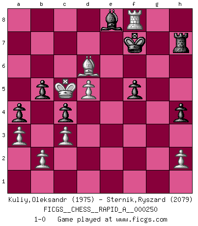 Last move : 1-0 2020 April 19 19:44:36 [Event "FICGS__CHESS__RAPID_A__000250"] [Site "FICGS"] [Date "2020.01.31"] [Round "1"] [White "Kuliy,Oleksandr"] [Black "Sternik,Ryszard"] [Result "1-0"] [WhiteElo "1975"] [BlackElo "2079"] 1.d4 Nf6 2.Nf3 d5 3.Bf4 e6 4.e3 Bd6 5.Ne5 O-O 6.Bd3 c5 7.c3 Qc7 8.Nd2 Nc6 9.Ndf3 Ne7 10.O-O b6 11.Nd2 a5 12.Re1 Bb7 13.Qf3 Ng6 14.Bxg6 hxg6 15.Qh3 Rfd8 16.Rad1 Rac8 17.Ndf3 Ne4 18.Ng5 Nxg5 19.Bxg5 Re8 20.f4 Ba6 21.Qh4 a4 22.a3 Bb5 23.Rd2 Rf8 24.g4 Be8 25.f5 Bxe5 26.dxe5 exf5 27.gxf5 Qxe5 28.f6 Bc6 29.e4 gxf6 30.Bxf6 Qh5 31.Qxh5 gxh5 32.exd5 Rfe8 33.Be7 Bd7 34.Rf2 f5 35.Rfe2 Kf7 36.Kf2 Kg6 37.Re3 Rg8 38.Rg3+ Kf7 39.Rh3 Rh8 40.Bd6 Rce8 41.Rxe8 Kxe8 42.Bc7 b5 43.Bd6 c4 44.Be5 Rh7 45.Rh4 Kd8 46.Ke3 Be8 47.Rf4 Bd7 48.Rf3 Kc8 49.Rg3 Be8 50.Rg8 Kd8 51.Kd4 h4 52.Kc5 Ke7 53.Bd6+ Kf7 54.Rf8+ 1-0 Queen's pawn game Kingside Castling by player Black (move 5) Kingside Castling by player White (move 10) Player White won this chess game. Follow this game move after move (download)I play correspondence chess because it is both art and science while chess is art only. (A player at FICGS) Die starken Figuren des Gegners muss man abtauschen. (José Raúl Capablanca) Fischer no está bajo la obligación de nadie. (Joseph Platz) Botvinnik disait en comparant les échecs à la musique: Il existe une science dont le but est l'étude de l'acoustique et des sons. Mais il y a aussi un art qui se sert de l'océan des sons : c'est la musique. De toute évidence, il en est de même pour la pensée. La logique est l'étude des lois de la réflexion et les échecs reflètent, en tant qu'art, le côté logique de la réflexion, sous la forme d'images artistiques... Extrait de Fischer - Spassky, Reykjavik 1972 par Alexander & F. Wyndham (Ed. Solar), p 37. Even the best needles are not sharp at both ends. (Chinese proverb)