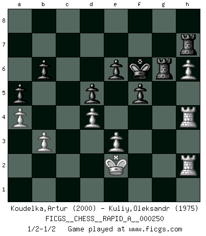 Last move : 1/2-1/2 2020 June 2 2:51:15 [Event "FICGS__CHESS__RAPID_A__000250"] [Site "FICGS"] [Date "2020.01.31"] [Round "1"] [White "Koudelka,Artur"] [Black "Kuliy,Oleksandr"] [Result "1/2-1/2"] [WhiteElo "2000"] [BlackElo "1975"] 1.e4 e6 2.d4 d5 3.Nc3 Nf6 4.Bg5 Bb4 5.e5 h6 6.exf6 hxg5 7.fxg7 Rg8 8.h4 Nc6 9.h5 Rxg7 10.Bb5 Bd7 11.Qd3 Qf6 12.O-O-O O-O-O 13.g4 Qf4+ 14.Qe3 Qxg4 15.h6 Rh7 16.Nf3 Be7 17.Bxc6 Bxc6 18.Rdg1 Qf4 19.Nxg5 Bxg5 20.Rxg5 Qxe3+ 21.fxe3 Rdh8 22.Rgh5 a5 23.Ne2 Kd7 24.Kd2 b6 25.R1h2 Ke7 26.Nf4 Rg8 27.b3 f6 28.Rf2 Be8 29.Rh1 Rgh8 30.Rfh2 c6 31.c4 Bf7 32.Rh4 Rg8 33.cxd5 cxd5 34.Rc1 Kd6 35.Rf1 Rg5 36.Rf2 Ke7 37.Rfh2 Bg6 38.Nxg6+ Rxg6 39.a4 f5 40.Ke2 Kf6 1/2-1/2 French : MacCutcheon, Chigorin variation Queenside Castling by player White (move 12) Queenside Castling by player Black (move 12) This chess game ended in a draw. Follow this game move after move (download)If you aren't afraid of Spassky, then I have removed the element of money. (Jim Slater) Wenn ich gewinne bin ich ein Genie. Wenn nicht, dann bin ich keines. (Robert James Fischer) Por tratar de evitar la pérdida de una pieza, muchas personas han perdido una partida de Ajedrez. (Savielly Tartakover) La vérité est comme le meilleur coup aux échecs : elle existe, mais il faut la chercher. (Arturo Perez-Reverte) The general who wins the battle makes many calculations in his temple before the battle is fought. The general who loses makes but few calculations beforehand. (Sun Tzu)