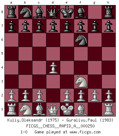 Last move : 1-0 2020 March 4 12:8:20 [Event "FICGS__CHESS__RAPID_A__000250"] [Site "FICGS"] [Date "2020.01.31"] [Round "1"] [White "Kuliy,Oleksandr"] [Black "Guralivu,Paul"] [Result "1-0"] [WhiteElo "1975"] [BlackElo "1983"] 1.d4 Nf6 2.Nf3 1-0 This chess game has been lost on time (started : 2020.01.31 20:14:54) Queen's pawn game Player White won this chess game. Follow this game move after move (download)A player surprised is half beaten. (Proverb) Jeder Schachmeister war einmal ein Anfänger. (Irving Chernev) Nunca nadie ha ganado una partida de Ajedrez rindiendose. (Unknown) J'ai vu le vaincu d'Echecs jouer des années durant dans l'espoir de la fête de la victoire. Car tu es plus riche de ce qu'elle existe si même elle n'est point pour toi. Ainsi de la perle du fond des mers. (Antoine de Saint-Exupéry) There are 10 types of people in this world: those who understand binary and those who don't. (Anonymous)
