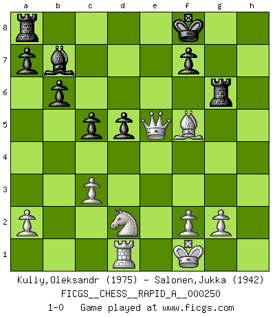 Last move : 1-0 2020 March 7 8:33:29 [Event "FICGS__CHESS__RAPID_A__000250"] [Site "FICGS"] [Date "2020.01.31"] [Round "1"] [White "Kuliy,Oleksandr"] [Black "Salonen,Jukka"] [Result "1-0"] [WhiteElo "1975"] [BlackElo "1942"] 1.d4 d5 2.Nf3 e6 3.Bf4 Nf6 4.e3 Bd6 5.Bg3 O-O 6.Nbd2 c5 7.c3 Nc6 8.Bd3 b6 9.Qe2 Bb7 10.Rd1 Re8 11.e4 Bxg3 12.hxg3 h6 13.e5 Ne7 14.exf6 gxf6 15.Rxh6 Nf5 16.Rh3 Kg7 17.g4 Qc7 18.gxf5 exf5 19.Ne5 fxe5 20.Qh5 Kf8 21.Qg5 exd4 22.Kf1 Qe5 23.Qh6+ Qg7 24.Qd6+ Kg8 25.Rg3 dxc3 26.bxc3 Re6 27.Rxg7+ Kxg7 28.Qg3+ Rg6 29.Qe5+ Kf8 30.Bxf5 1-0 Queen's pawn game Kingside Castling by player Black (move 5) Player White won this chess game. Follow this game move after move (download)After a bad opening, there is hope for the middle game. After a bad middle game, there is hope for the endgame. But once you are in the endgame, the moment of truth has arrived. (Edmar Mednis) Schon mancher Spieler hat aufgegeben, um zu vermeiden, daß er eine Figur verliert. (Savielly Grigorievitsch Tartakower) Con el fin de mejorar tu juego, debes de estudiar los finales antes que todo, ya que mientras que los finales pueden ser estudiados y dominados por sí mismos, el juegomedio y la apertura deben de ser estudiados en relación con los finales. (José Raúl Capablanca) Plusieurs personnes se sont demandées comment Tal faisait pour gagner... En fait, c'est très simple ! Il met ses pièces au centre de l'échiquier et les sacrifie quelque part ! (David Bronstein) Internal peace cannot coexist with external war. (Don Groves)