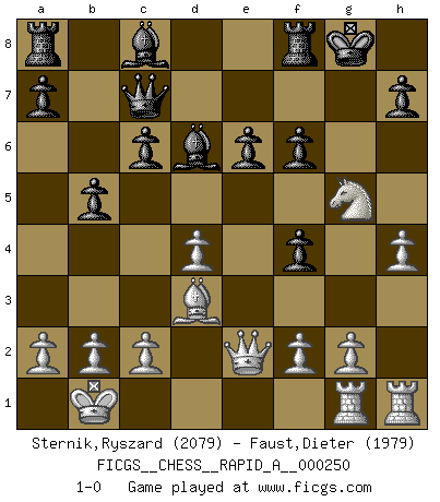 Last move : 1-0 2020 February 27 16:0:19 [Event "FICGS__CHESS__RAPID_A__000250"] [Site "FICGS"] [Date "2020.01.31"] [Round "1"] [White "Sternik,Ryszard"] [Black "Faust,Dieter"] [Result "1-0"] [WhiteElo "2079"] [BlackElo "1979"] 1.e4 Nf6 2.e5 Ng8 3.d4 d6 4.Nf3 dxe5 5.Nxe5 Nf6 6.Nc3 e6 7.Be3 Bd6 8.Qf3 O-O 9.O-O-O Nbd7 10.h4 c6 11.Bg5 Be7 12.Ne4 Nxe4 13.Qxe4 Nf6 14.Bxf6 gxf6 15.Bd3 f5 16.Qe3 f6 17.Nf3 Bd6 18.Kb1 Qc7 19.Rdg1 f4 20.Qe2 b5 21.Ng5 1-0 Alekhine's defense : Brooklyn defense Kingside Castling by player Black (move 8) Queenside Castling by player White (move 9) Player White won this chess game. Follow this game move after move (download)My opponents make good moves too. Sometimes I don't take these things into consideration. (Bobby Fischer) Ich las kürzlich ein Buch von Nietzsche. Er sagte Religion verdumme nur die Menschen. Ich stimme zu. (Robert James Fischer) Un mal plan es mejor que no tener ningún plan. (Frank Marshall) L'attaque fait le spectacle, la défense gagne les matchs. (Dicton footballistique) Luck never gives; it only lends. (Swedish proverb)