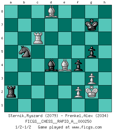 Last move : 1/2-1/2 2020 April 2 20:23:14 [Event "FICGS__CHESS__RAPID_A__000250"] [Site "FICGS"] [Date "2020.01.31"] [Round "1"] [White "Sternik,Ryszard"] [Black "Frenkel,Alex"] [Result "1/2-1/2"] [WhiteElo "2079"] [BlackElo "2034"] 1.e4 e5 2.Nf3 Nc6 3.Bb5 a6 4.Ba4 Nf6 5.O-O Be7 6.Re1 b5 7.Bb3 O-O 8.c3 d6 9.h3 Nb8 10.d4 Nbd7 11.Nbd2 Bb7 12.Bc2 Re8 13.Nf1 Bf8 14.Bg5 h6 15.Bh4 Qc8 16.Ng3 g6 17.Qd2 Bg7 18.Rad1 c5 19.dxc5 dxc5 20.Nf1 c4 21.Ne3 Bc6 22.b3 cxb3 23.axb3 Ra7 24.Nd5 Bxd5 25.exd5 e4 26.Nd4 Nxd5 27.Nxb5 axb5 28.Qxd5 Nc5 29.b4 Na4 30.Qxb5 Nxc3 31.Qxe8+ Qxe8 32.Rd8 Qxd8 33.Bxd8 Be5 34.Bb3 Bd4 35.h4 Rb7 36.Ba5 Kg7 37.g3 f5 38.Kg2 Kf6 39.Rc1 g5 40.hxg5+ hxg5 41.b5 Nxb5 42.Rc6+ Kg7 43.Be6 f4 44.Bf5 Ra7 45.Bd8 Ra2 46.Bxe4 1/2-1/2 Ruy Lopez : Closed, 7...O-O Kingside Castling by player White (move 5) Kingside Castling by player Black (move 7) This chess game ended in a draw. Follow this game move after move (download)What is the object of playing a gambit opening?... To acquire a reputation of being a dashing player at the cost of losing a game. (Siegbert Tarrasch) Immer nach dem besten Zug zu suchen ist ziemlich unpraktisch. (Nigel Short) La mitad de las variaciones que son calculadas en una partida de torneo, resultan ser completamente superfluas. Desafortunadamente, nadie sabe por adelantado cual mitad. (Jan Tinman) Dieu déplace le joueur, et celui-ci la pièce. Quel Dieu derrière Dieu commence donc la trame ? Arturo Perez-Reverte (prix de littérature policière 1993). I don't know, I don't care, and it doesn't make any difference. (Albert Einstein)