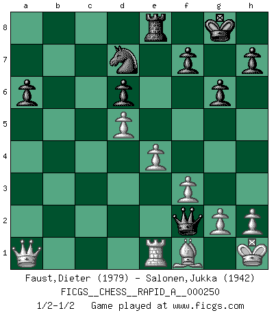Last move : 1/2-1/2 2020 March 2 7:54:32 [Event "FICGS__CHESS__RAPID_A__000250"] [Site "FICGS"] [Date "2020.01.31"] [Round "1"] [White "Faust,Dieter"] [Black "Salonen,Jukka"] [Result "1/2-1/2"] [WhiteElo "1979"] [BlackElo "1942"] 1.Nf3 Nf6 2.c4 c5 3.d4 e6 4.d5 exd5 5.cxd5 d6 6.Nc3 g6 7.Nd2 Nbd7 8.e4 Bg7 9.Be2 O-O 10.O-O Re8 11.Re1 Ne5 12.a4 a6 13.a5 Bg4 14.f3 Bd7 15.Nf1 b5 16.axb6 Qxb6 17.Kh1 Bb5 18.Ne3 c4 19.b3 Nfd7 20.bxc4 Nxc4 21.Nxb5 Nxe3 22.Bxe3 Qxe3 23.Nc7 Bxa1 24.Qxa1 Qf2 25.Nxe8 Rxe8 26.Bf1 1/2-1/2 Reti Opening Kingside Castling by player Black (move 9) Kingside Castling by player White (move 10) This chess game ended in a draw. Follow this game move after move (download)Up to this point White has been following well-known analysis. But now he makes a fatal error: he begins to use his own head. (Siegbert Tarrasch) Jeder Fehler erscheint unglaublich dumm, wenn andre ihn begehen. (Georg Christoph Lichtenberg) El Ajedrez es tan inspirador que yo no creo que un buen jugador sea capaz de tener un pensamiento malo durante una partida. (Wilhelm Steinitz) On n'a jamais que l'âge auquel on a commence à jouer aux échecs car après on cesse de vieillir. (Capablanca) Men should grow up. - Yeah. And dogs should stop licking themselves. It's not gonna happen. (Gregory House to Dr. Cameron, House M.D.)