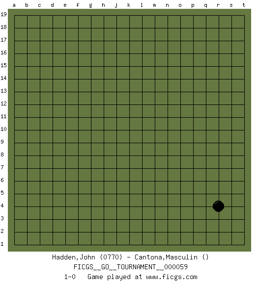 Last move : 1-0 2020 March 3 11:49:11 [Event "FICGS__GO__TOURNAMENT__000059"] [Site "FICGS"] [Date "2020.02.01"] [Round "1"] [Black "Hadden,John"] [White "Cantona,Masculin"] [Result "1-0"] [Rating 1 "0770"] 1.r4 1-0 This go game has been lost on time (started : 2020.02.01 0:37:32) Here are the names of the openings (joseki) played in the four corners : Corner q4 : r4 1-0 Komoku (Somok, Xiao~mu`) 3-4 Point. The komoku (3-4) point is the traditional corner enclosure move.. Player Black won this Go (weiqi, baduk) game. Follow this game move after move (download)The carpenter's square becomes ko. (Anonymous) I can't decide which is riskier; taking crazy risks, or taking advice on crazy risks from a crazy risk taker. (Gregory House in House M.D.)