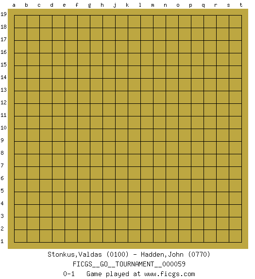 Last move : 0-1 2020 March 2 5:57:27 [Event "FICGS__GO__TOURNAMENT__000059"] [Site "FICGS"] [Date "2020.02.01"] [Round "1"] [Black "Stonkus,Valdas"] [White "Hadden,John"] [Result "0-1"] [Rating 1 "0100"] [Rating 2 "0770"] 0-1 This go game has been lost on time (started : 2020.02.01 0:37:32) Here are the names of the openings (joseki) played in the four corners : Player White won this Go (weiqi, baduk) game. Follow this game move after move (download)Don't reduce your own liberties. (Bill Taylor) At last I discovered the true beauty of chess. So I proposed to her. (Dinesh De Silva)