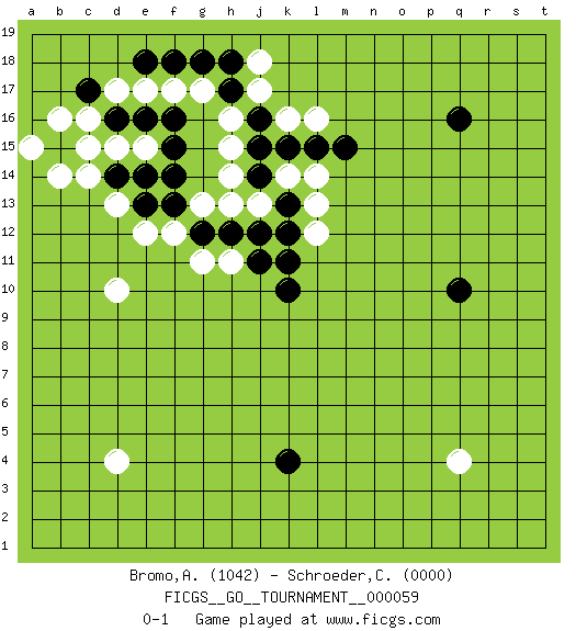 Last move : 0-1 2020 June 2 23:55:24 [Event "FICGS__GO__TOURNAMENT__000059"] [Site "FICGS"] [Date "2020.02.01"] [Round "1"] [Black "Bromo,Alexis"] [White "Schroeder,Christoph"] [Result "0-1"] [Rating 1 "1042"] [Rating 2 "0000"] 1.q16 d4 2.d16 q4 3.q10 d10 4.k4 k16 5.k10 d15 6.c15 c16 7.c17 b16 8.d14 e15 9.e16 c14 10.b15 b14 11.e14 a15 12.f15 c15 13.f16 d13 14.e13 e12 15.f13 f12 16.g12 g11 17.h12 h11 18.j11 g13 19.f14 h13 20.j12 j13 21.k13 k14 22.j14 h14 23.j15 h15 24.j16 h16 25.k15 l14 26.l15 l13 27.k12 l12 28.k11 l16 29.m15 j17 30.h17 g17 31.h18 j18 32.g18 f17 33.f18 e17 34.e18 d17 0-1 This go game has been lost on time (started : 2020.02.01 0:37:32) Here are the names of the openings (joseki) played in the four corners : Corner d16 : d16 d15 Hoshi (Hwajeom, Seongjeom, Xingwei`) 4-4 Point. The star or hoshi (4-4) point, emphasizing influence at the potential expense of territory. Corner q16 : q16 l14 Hoshi (Hwajeom, Seongjeom, Xingwei`) 4-4 Point. The star or hoshi (4-4) point, emphasizing influence at the potential expense of territory. Corner d4 : d4 0-1 Hoshi (Hwajeom, Seongjeom, Xingwei`) 4-4 Point. The star or hoshi (4-4) point, emphasizing influence at the potential expense of territory. Player White won this Go (weiqi, baduk) game. Follow this game move after move (download)Conservative and slow will win. Believe it ! (Anonymous) Opportunities multiply as they are seized. (Sun Tzu)